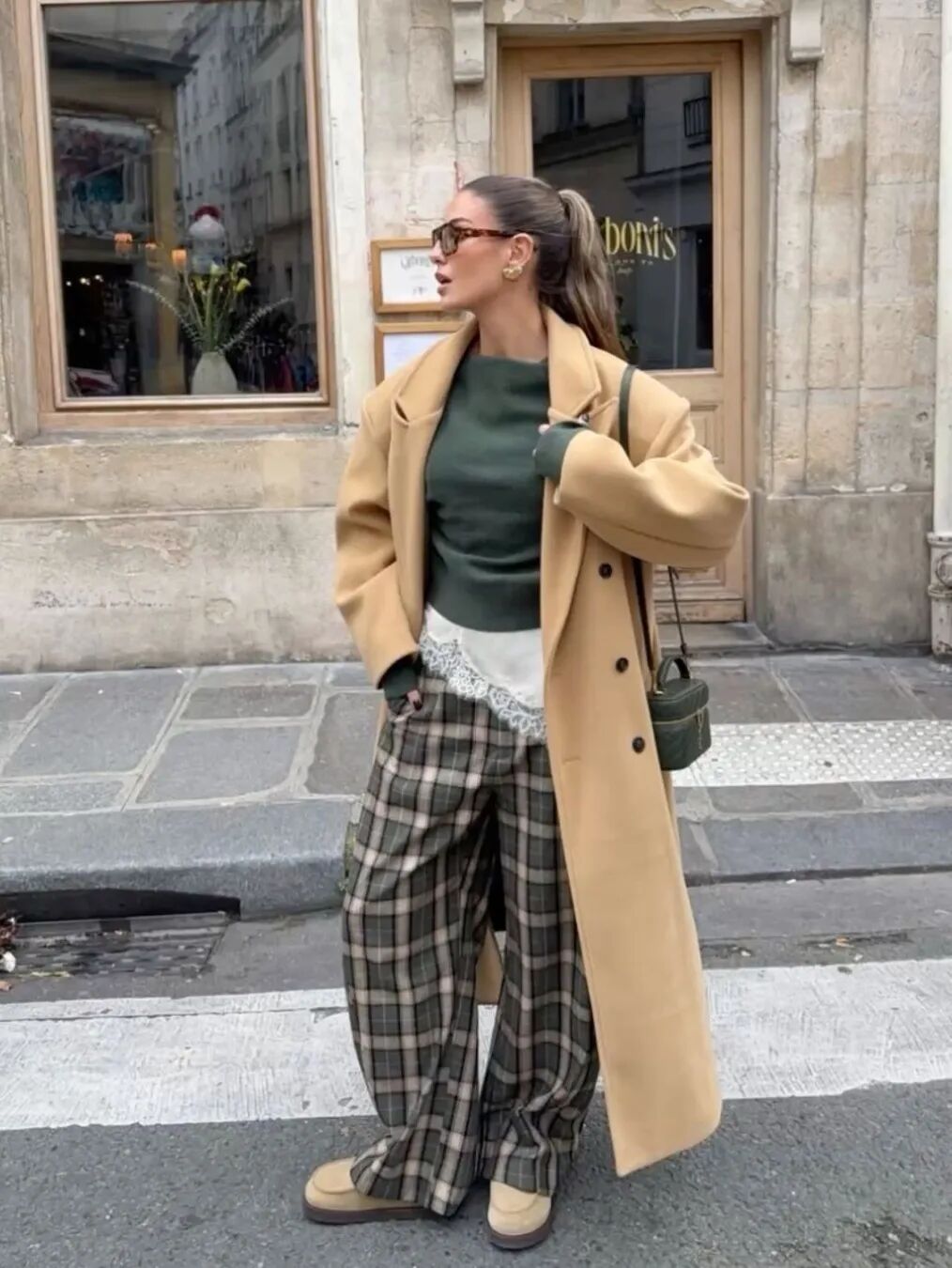 在上衣或外套的颜色选择上,可以提取格纹中的某一个颜色作为呼应。例如,如果你的格纹中有棕色线条,那就搭配一件棕色的毛衣或外套,这样会让整体造型看起来无比和谐高级。