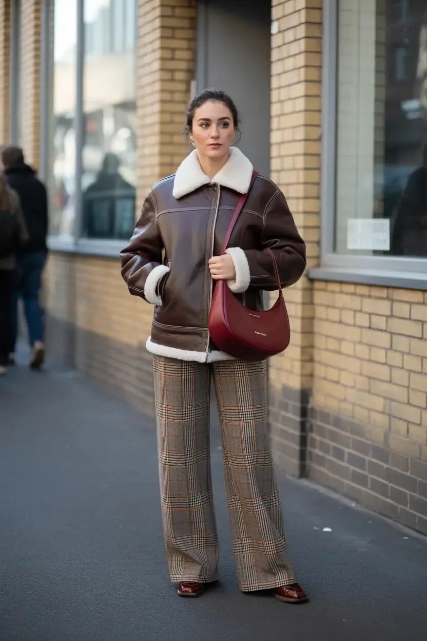 质感咖色皮夹克搭配同系格纹阔腿裤,浓郁的复古气息扑面而来。统一的色调呈现高级质感,而不同材质的碰撞更添层次趣味。一双红色皮鞋与手提包的加入,瞬间点燃整体造型,恰如一杯醇厚拿铁中注入的樱桃糖浆,大胆醒目却毫不突兀。