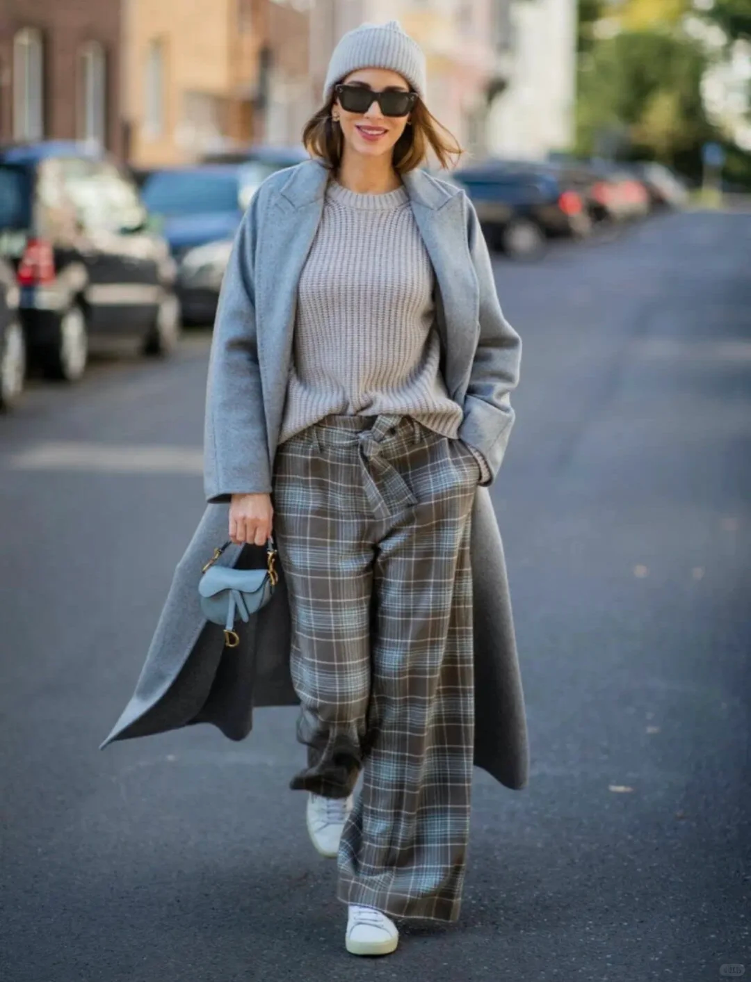 冬季首选羊毛呢、针织或灯芯绒等具有厚实感和垂坠感的面料。它们能保证保暖度的同时,让格纹看起来更加高级有质感。