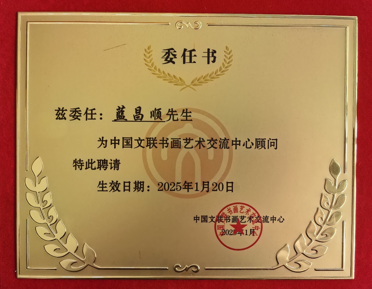 2019年5月蓝昌顺书法作品被中华人民共和国外交部收藏;