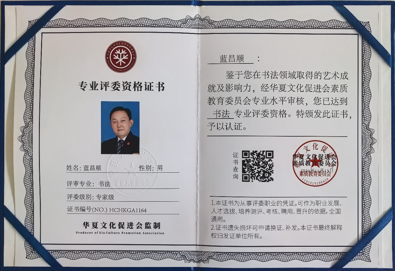 2023年10月荣获《人民艺术家资质证书》被授予“中国人民艺术家”并评定书法作品市场润格为每平方尺为20000元。