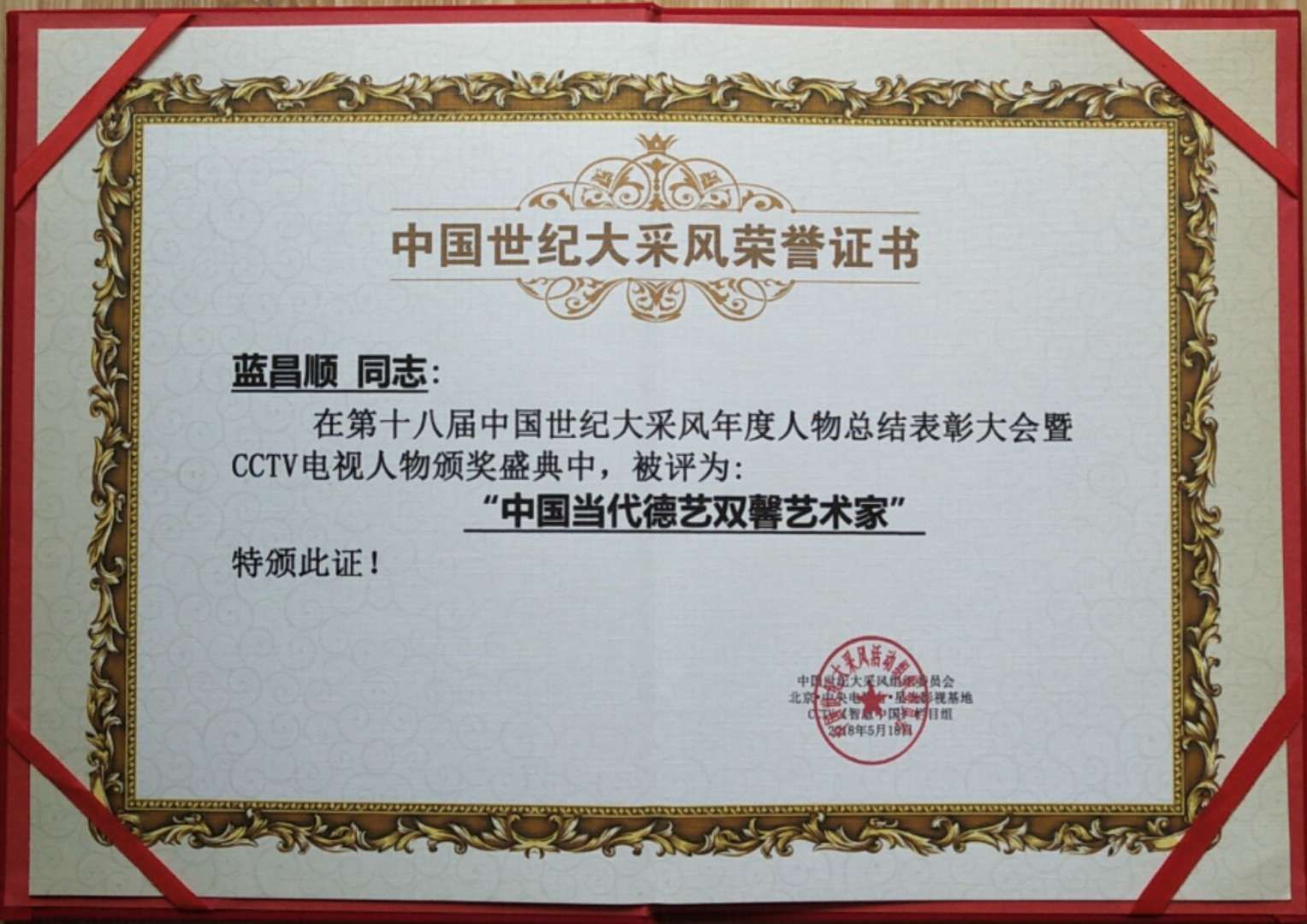 2018年5月18日在第十八届中华世纪大采风年度总结表彰大会暨CCTV电视人物颁奖盛典荣获“中国当代德艺双馨艺术家”;