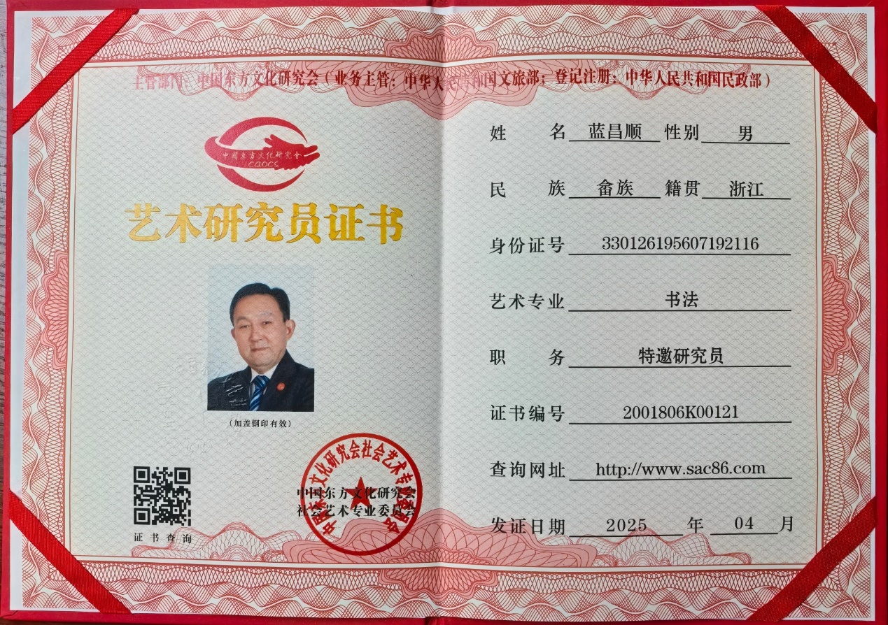 蓝昌顺,男、畲族、浙江建德人。杭州弘浙知识产权代理事务所所长,中国管理科学研究院学术委员会调研员,杭州市商标代理专业委员会执行委员,中国文联书画艺术交流中心顾问,中国楹联学会会员,中国互联网联盟艺术总监,华夏文化促进会专家评委,中国东方文化研究会特邀研究员,中国教育电视台“水墨丹青栏目组”水墨丹青书画院会员,中国民族建筑研究会书画艺术专业委员会理事,中国世纪大采风书画院院士,企业家日报社艺术研究院研究员,中国民族贸易促进会商标品牌专家,新时代品牌强国蓝海工程·名牌智库专家顾问,中国乡土艺术协会会员,杭州市民族团结促进会会员,《收藏天下》数字电视频道特邀艺术家,中华名家网高级研究员,曲阜鸿儒书画院名誉院长,北京古今翰墨书画院副院长,中国一级书法师等。2009年以来入编书刊典籍有:《中国专家名人辞典》《中国收藏》杂志艺术特刊,《中国书画名家作品集》《中国名家作品收藏与鉴赏》《中国书画家百科》《中国美术年鉴》《走向世界的中国学者》《学术之路》《祖国先锋》《伟大征程》《聚焦·四十周年》《艺栈津渡百强企业招牌匾书画作品展示》《中国影响力人物》《共和国美术大典》《中国美术通史》《企业家品格》《中国名人大典》《故宫百年书画经典》《国学经典》等。