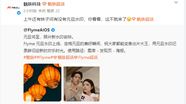 日前,@FlymeAIOS 晒出了配上了自家元旦水印的照片,并配文称,“元旦将至,照片新水印安排。Flyme 元旦水印上线,定格元旦的美好瞬间,祝大家都能变身出片大王,用元旦水印记录辞旧迎新的欢乐时光。使用路径:图库 - 发现页 - 海报。”同时,@魅族科技 官博也转发了该条微博,并称,“上午还有铁子问有没有元旦水印,你看看,这不就来了”。
