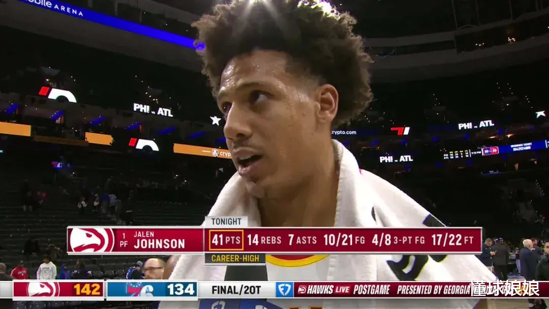 本赛季至今,杰伦-约翰逊场均是21.9分9.6板7.3助。