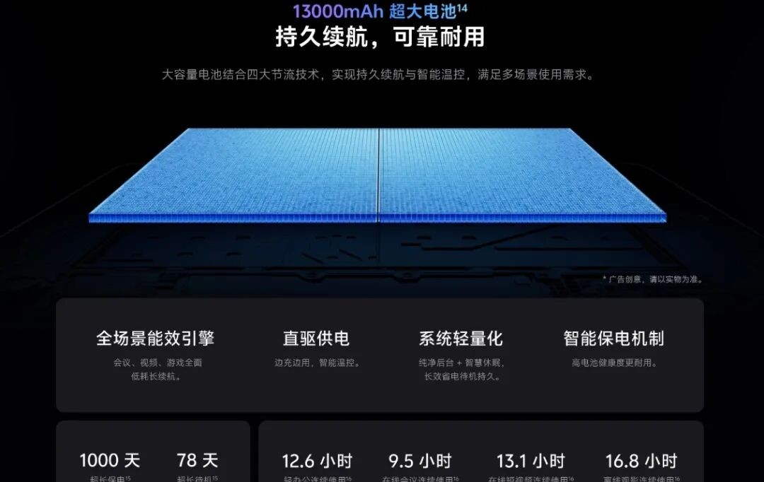 (注:价格档位为8+256GB/4499元、12+256GB/4999元、12+512GB/5299元、16+512GB/6699元;电池容量13000mAh;充电功率90W;屏幕峰值亮度1200尼特;分辨率3840×2512;安兔兔跑分超420万)