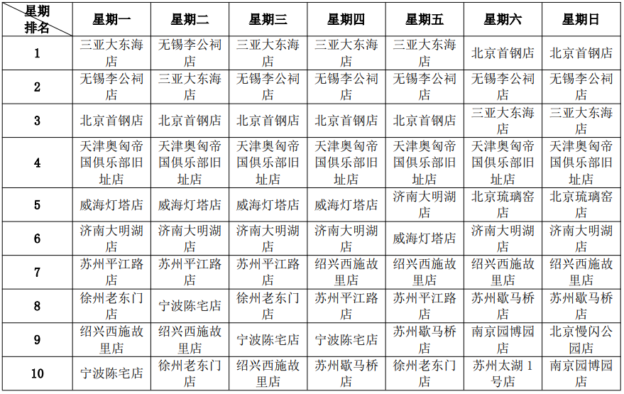 (4)营业额结构点评:无独有偶,营业额每周7天的TOP10,不仅全国门店与上海门店重叠,而且排名与客流每周7天的TOP10完全一样,它表明,虽然门店地处上海远郊,但这座超大城市的消费能力仍然遥遥领先。据统计,市外门店的日度营业额榜首,其业绩体量可达全部门店总冠军的50%。