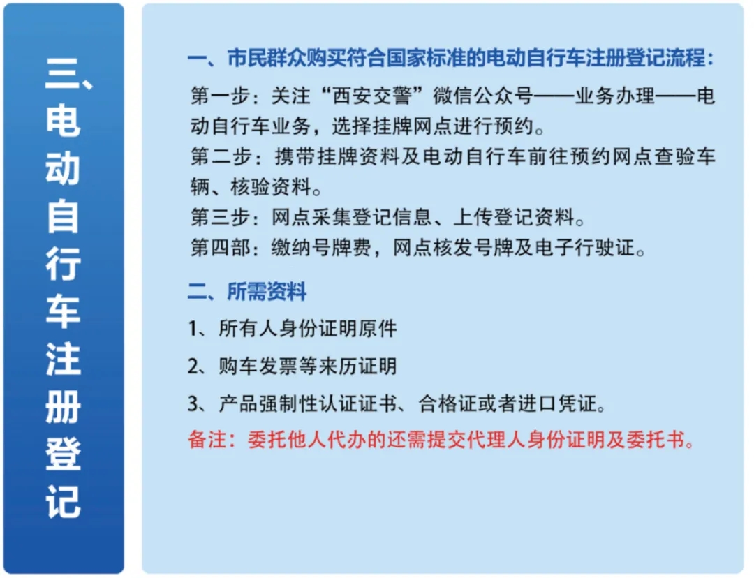 第一步 线上预约关注“西安交警”微信公众号 → 点击底部菜单【业务办理】→ 选择【电动自行车业务】→ 填写车辆及个人相关信息→就近选择挂牌网点并预约时间。