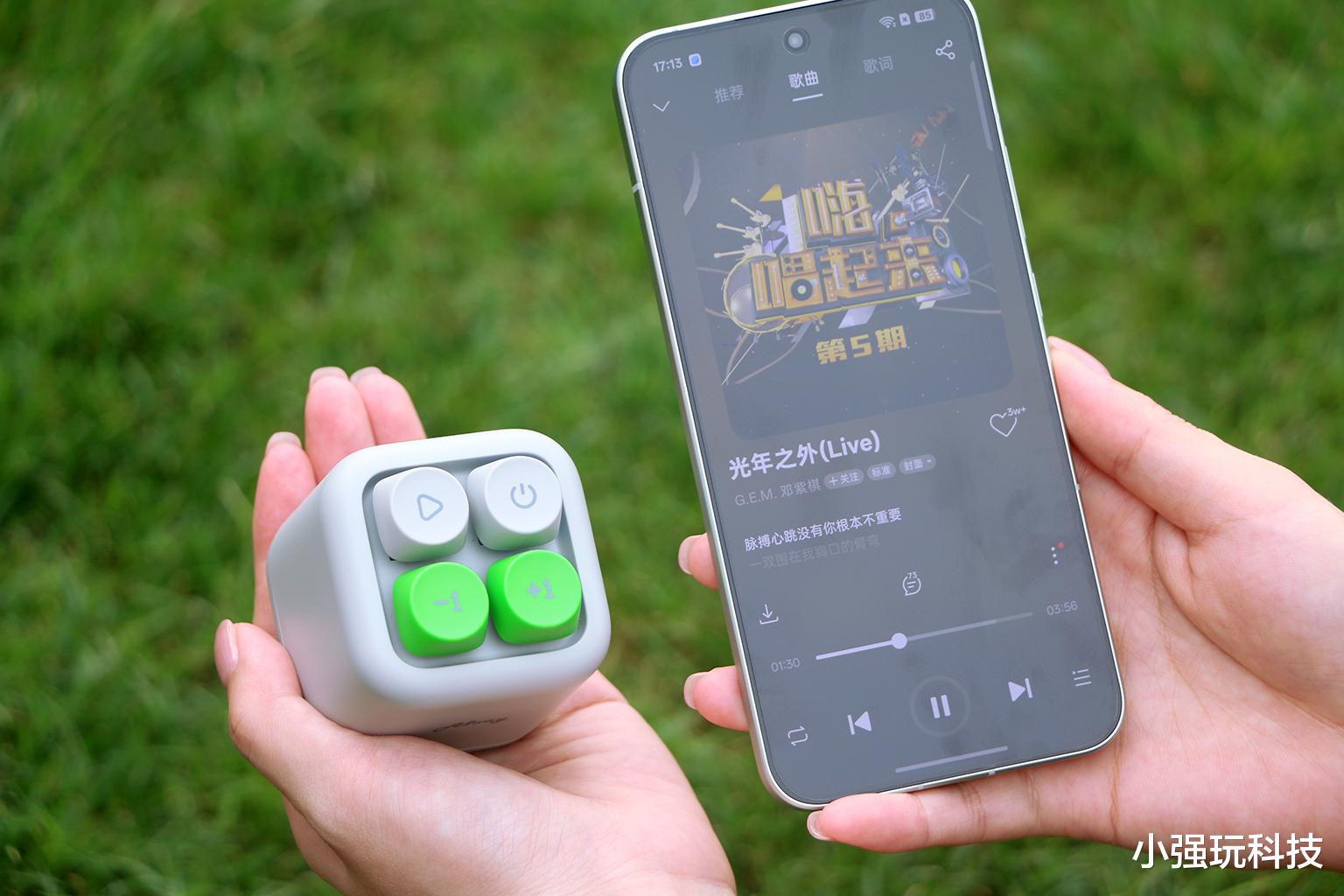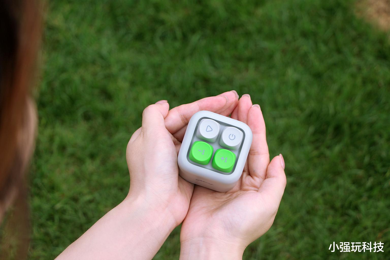 音箱顶部为其主要操控区域,采用机械键盘风格按键设计,每敲击一次都能带来生理级解压。分布有播放/暂停键、电源键、-1和+1键,通过这些组合按键可以切换音箱模式,控制音乐切换、音量调整以及切换语言包等功能,初次操作可能较复杂,多使用几次就能熟悉掌握。