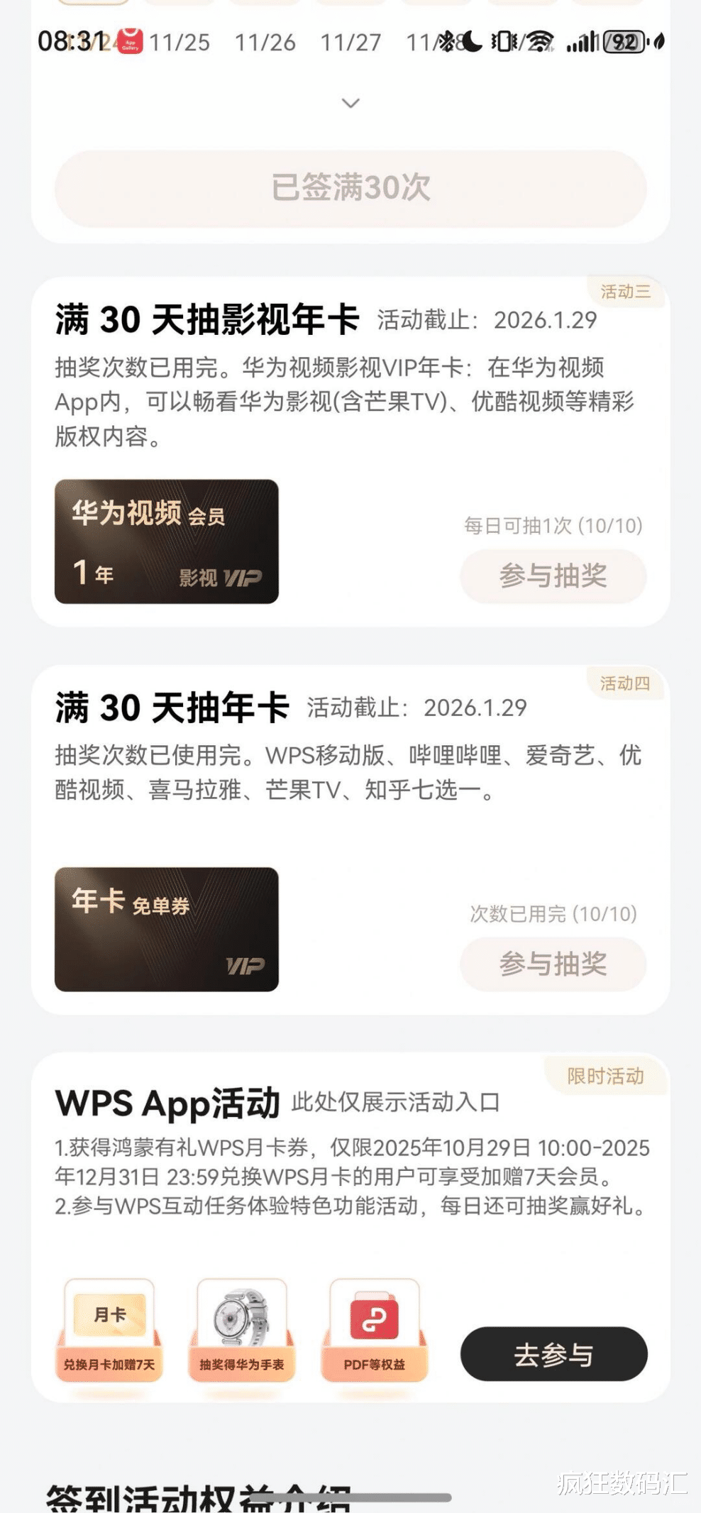 更吸引人的是,首次签到后满30天,还能参与影视年卡礼包抽奖,每天有1次机会,最多能抽10次,抽中影视年卡就能在华为视频App内可以畅看华为影视(含芒果TV)、优酷视频等版权视频,不管是追《狙击蝴蝶》这类热播剧,还是看经典老片、热门综艺,都能畅看无忧。另外还能参与热门应用年卡免单券抽奖,哔哩哔哩、WPS移动版、爱奇艺等热门应用八选一,不管是追剧、办公还是学习,都能用到。