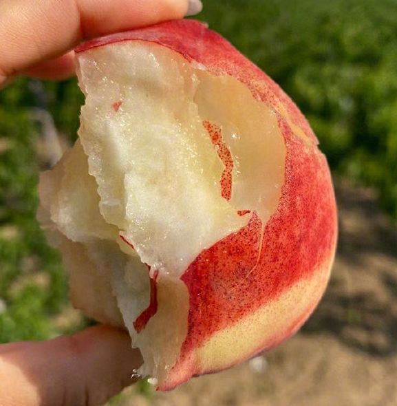 自然成熟的桃,自带一缕清甜的香味。若凑近细闻没有果香味,捏着还硬邦邦,个头还很大,这多半是催熟的,口感不好,果断放弃。