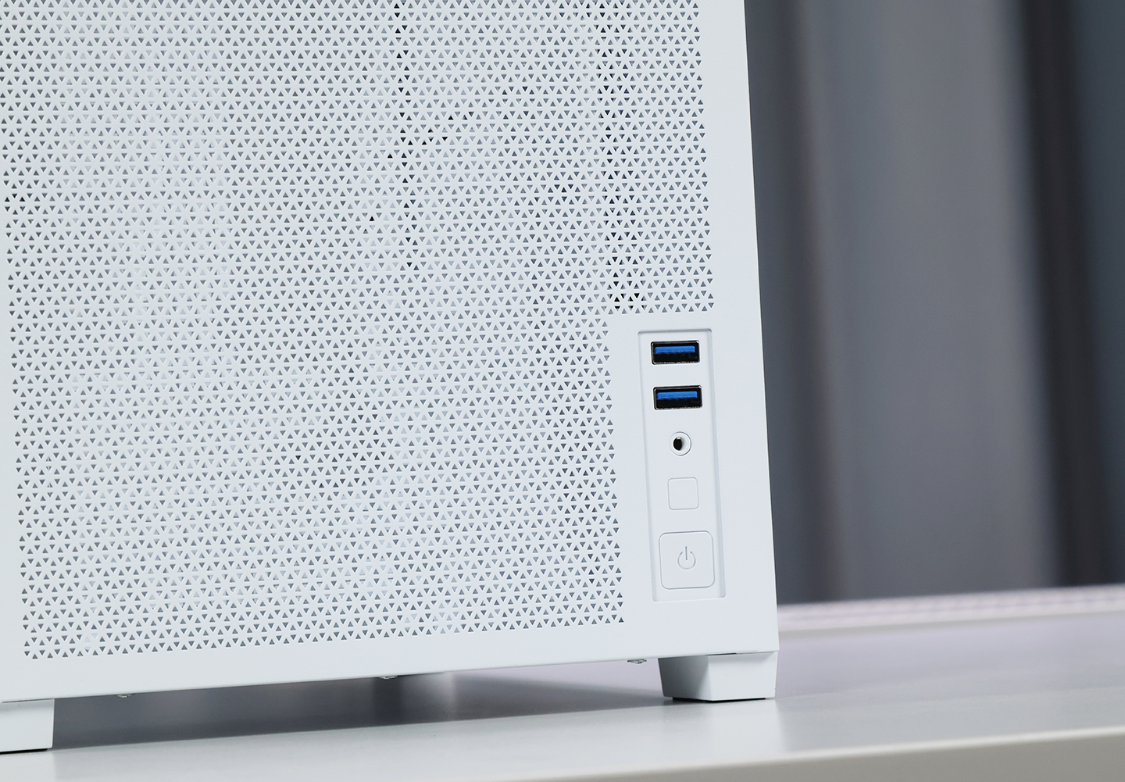 机箱I/O面板位于机箱前脸底部右侧,I/O布局简单并提供了2个USB 3.0接口、1个3.5mm音频口、1个方形的重启按钮和1个电源按钮开关。