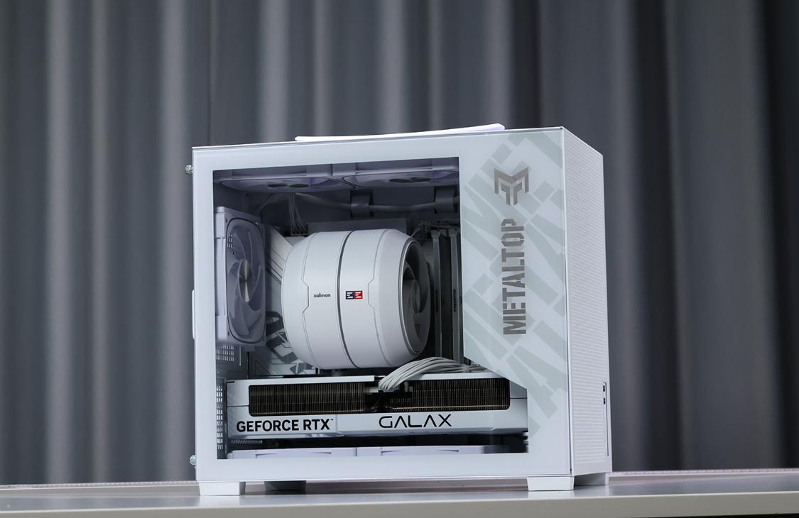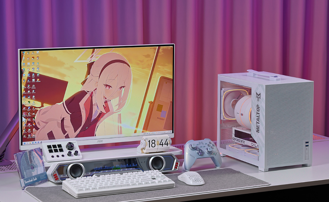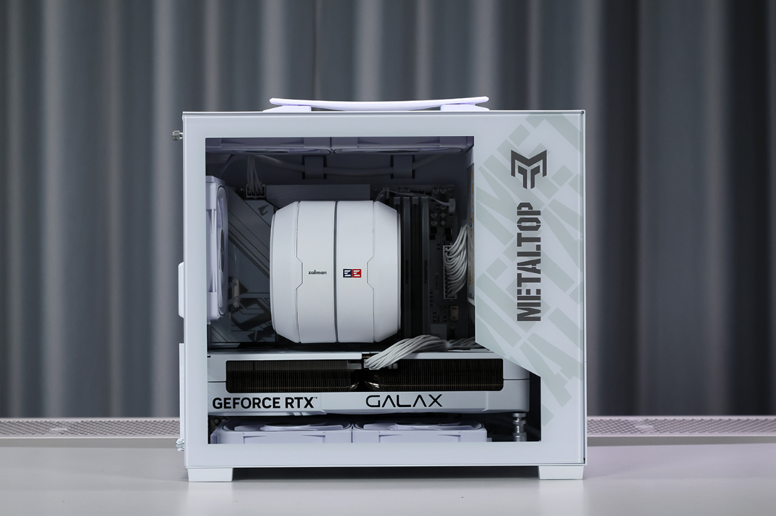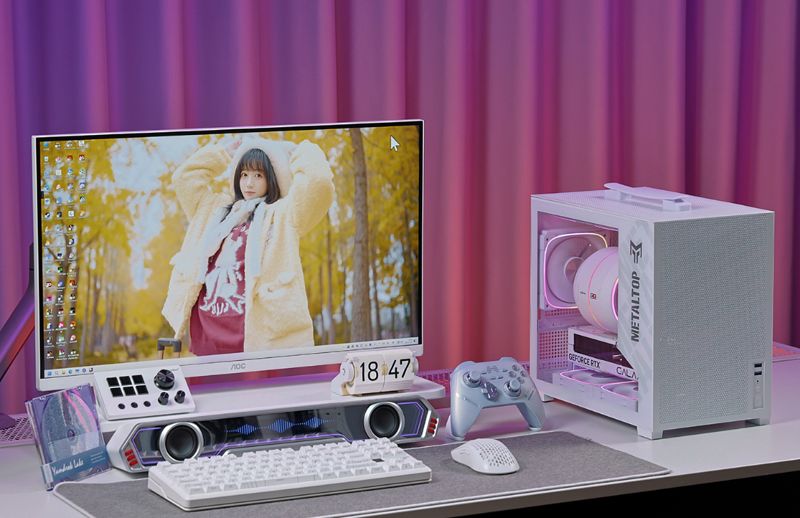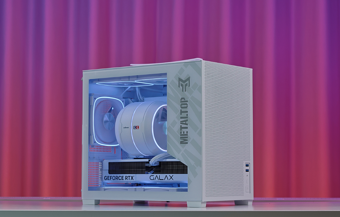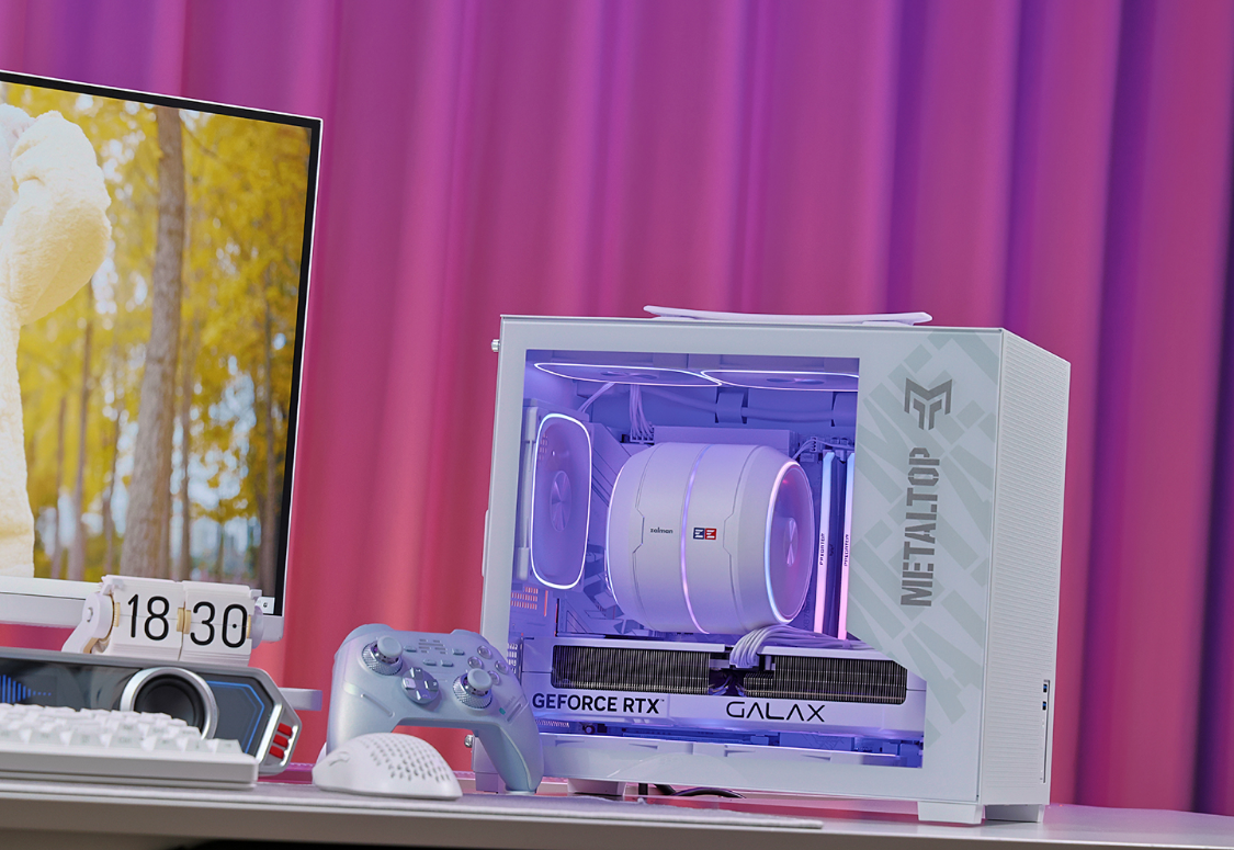 影驰金属大师T240 白色机箱,三围:263*212*343mm,体积约23L,净重4.05KG,紧凑但不失质感。机箱采用钢化玻璃侧透设计,机箱顶部、前部、底部及尾部均为MESH网孔面板,顶部网板与机箱前脸还采用了一体式弯折设计,整体结构强度有保障。