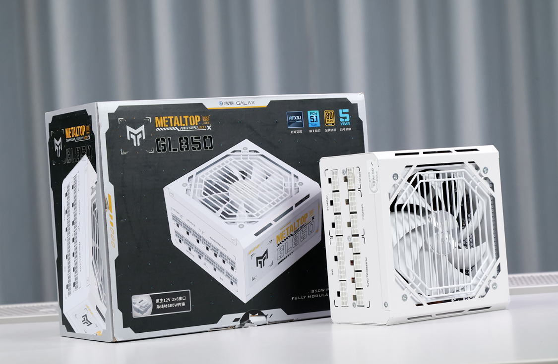 影驰金属大师GL850全模组电源,电源采用全日系电解电容,支持最新的ATX 3.1电源规范和PCIe 5.1电源标准,并通过了80Plus金牌认证以及国家3C认证。同时,电源还内置了OVP过压、SCP过流、OTP过温、OPP过功率等多重保护,此外,还有5年质保服务兜底。