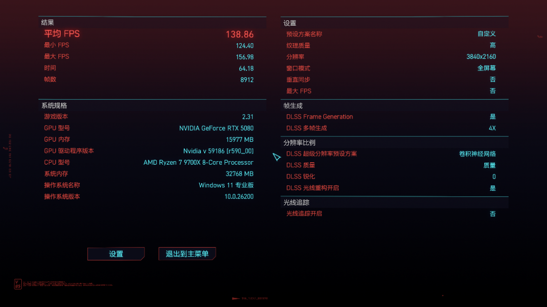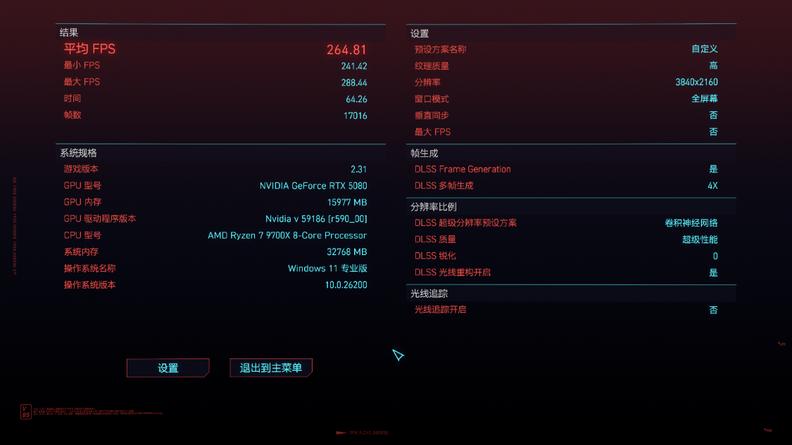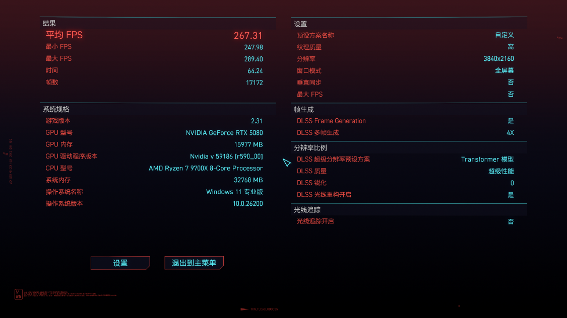 《极限竞速·地平线5》测试,4K分辨率下,极端画质,极端光追,开启DLSS 3.0并设为超高性能模式,游戏平均帧数213 FPS,DLSS为质量模式时,游戏平均帧数187 FPS;