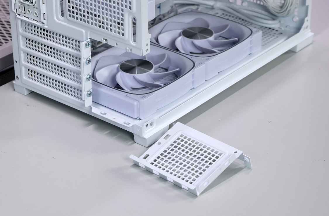 机箱最大支持MATX规格主板,显卡安装限长330mm(调整机箱电源支架后,显卡会限长降为252mm)。机箱采用电源仓前置设计,并通过1根C13/C14电源延长线延伸至机箱尾部。最大支持安装长度在140mm以内的ATX规格电源,支持三档高度调节。风冷安装限高178mm,并支持顶置240冷排(需要调整电源支架)。机箱最多可同时安装6把120规格散热风扇。而在机箱底部还预留了硬盘安装孔,可以支持安装2*3.5寸+1*2.5寸或3*2.5寸SATA硬盘