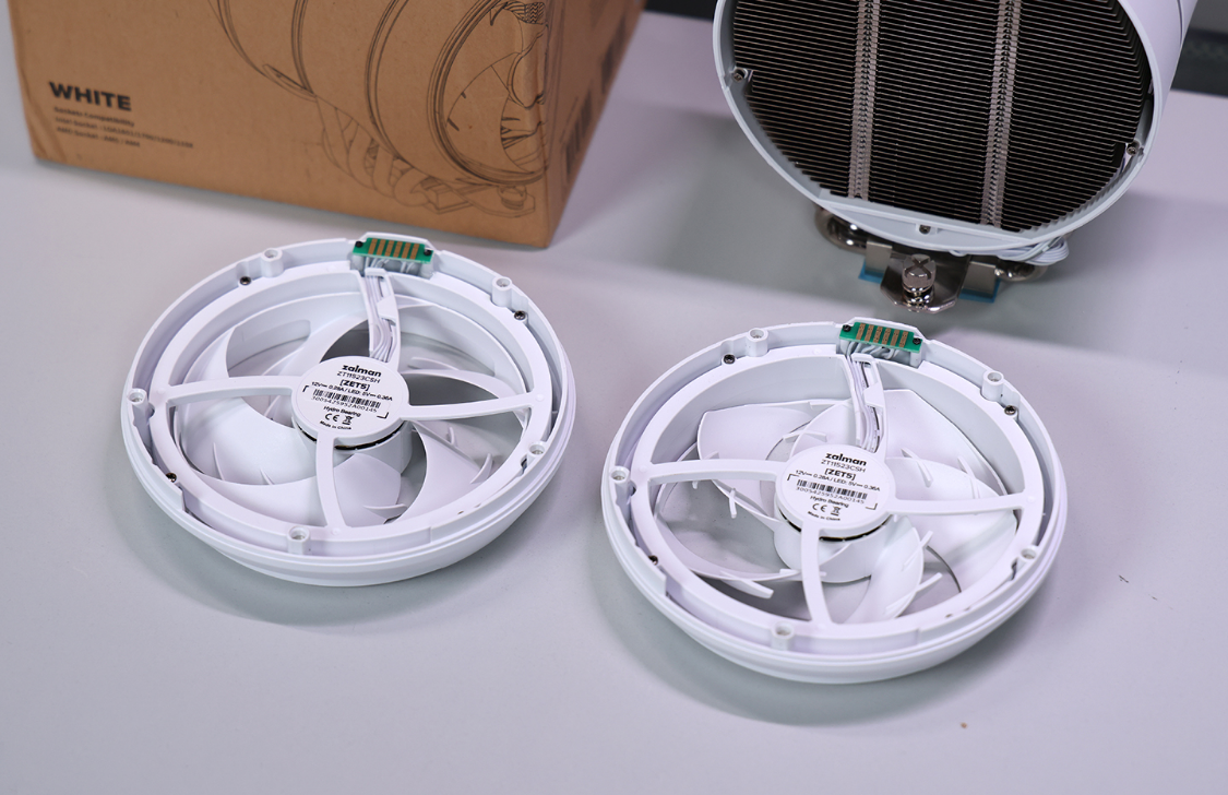 风冷配备一正一反两把AF120磁吸式环流风扇,通过金属触点与散热本体相连。风扇采用高转速马达和静音轴承,最高可达2000±10%RPM。7片流线型扇叶均采用了流线型设计,扇叶采用了环流形扇叶设计,表面还设计了凸起结构,用于减少风扇运行时产生的风切声,风扇最大可提供44.48CFM±10%的风量和1.4mmH2O±10%的风压,而满载运行时的噪音仅有30.4分贝左右。