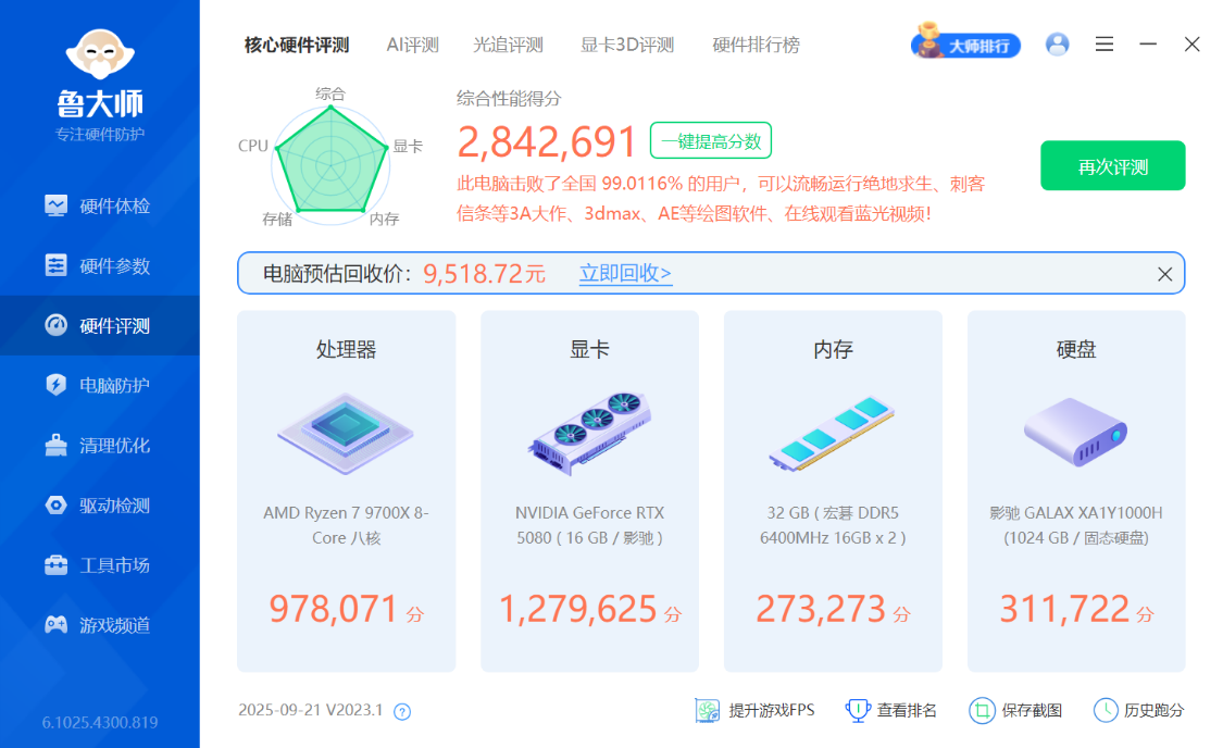 鲁大师整机测试,得分284.2W分。有一说一,这预估的回收价,五折卡得还挺准。