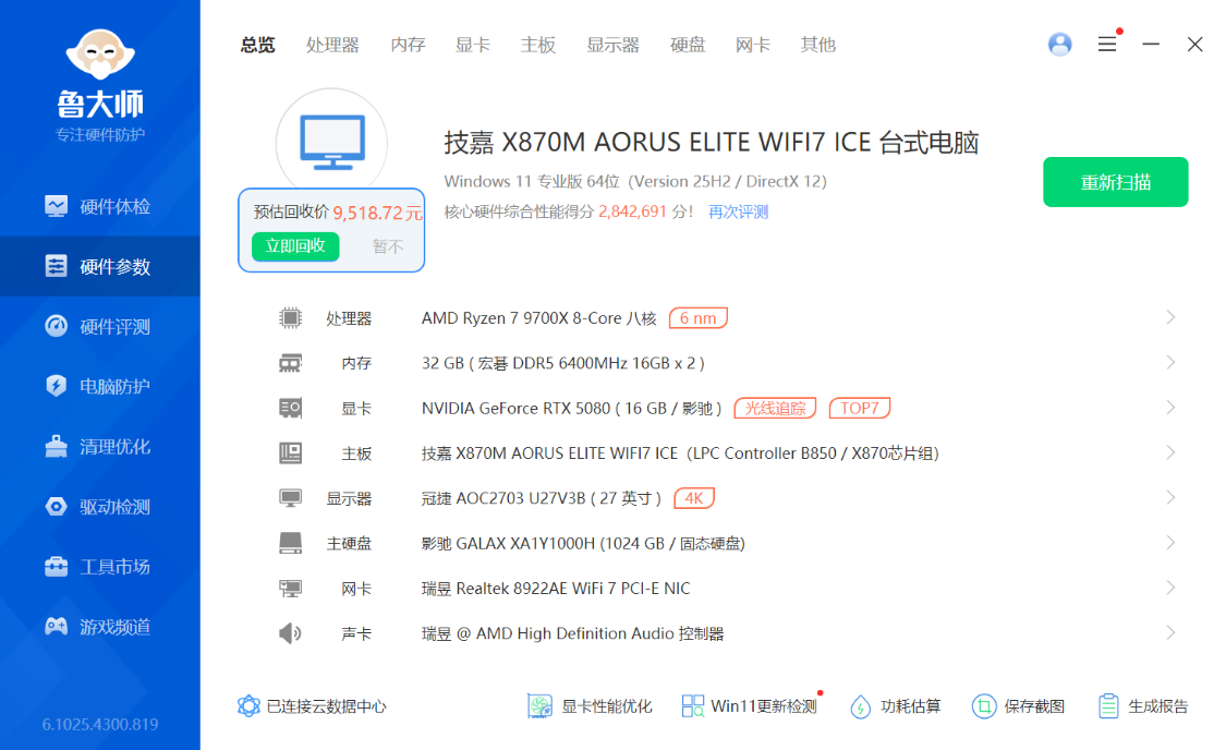 完整配置单:AMD R7-9700X处理器、技嘉X870M AORUS ELITE WIFI7 ICE主板、影驰RTX 5080 金属大师白金版OC显卡、宏碁掠夺者Hera影锋D5-6400MT/s C30冰戟银16G*2内存、影驰星曜7000 Plus 1T M.2固态硬盘、影驰金属大师T240白色机箱、思民ZET 5白色涡轮风冷、影驰金属大师GL-850金牌全模组电源、影驰魅影A120积木风扇*5(3正+2反)...时下行情价应该轻松1.7W左右了,而且刀把属性真不高了。