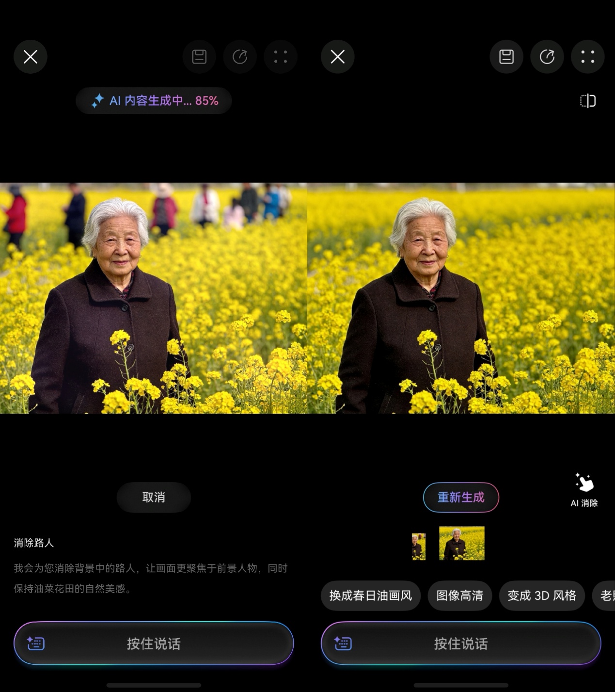 一路聊着,我们很快到了郊外的赏花地,满眼春色铺在眼前,好看得很。我给爷爷奶奶拍了不少照片,回看时发现照片里闯入了其他游客的身影,好好的画面乱糟糟的,可惜了这好景色。突然我想起小艺,调出照片直接说去掉多余路人。没一会儿照片就变了,杂乱的人群不见了。