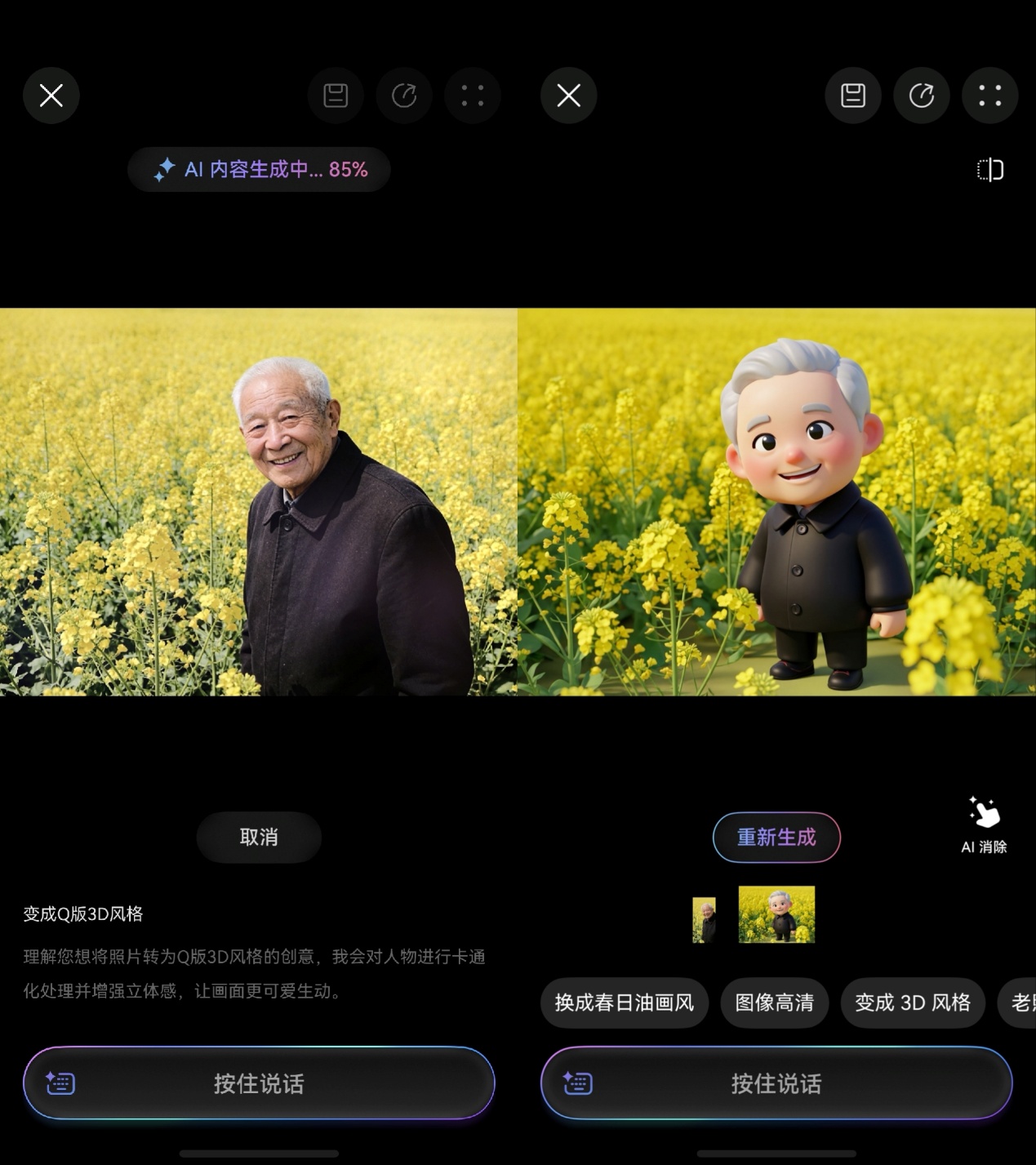 我还试着跟小艺说把爷爷的照片改成 Q版3D 风格,原本真实的人像变成了圆润可爱的 3D 卡通形象。爷爷凑到屏幕前看了又看,说这功能太新奇,没想到自己还能拍出这么有意思的照片。