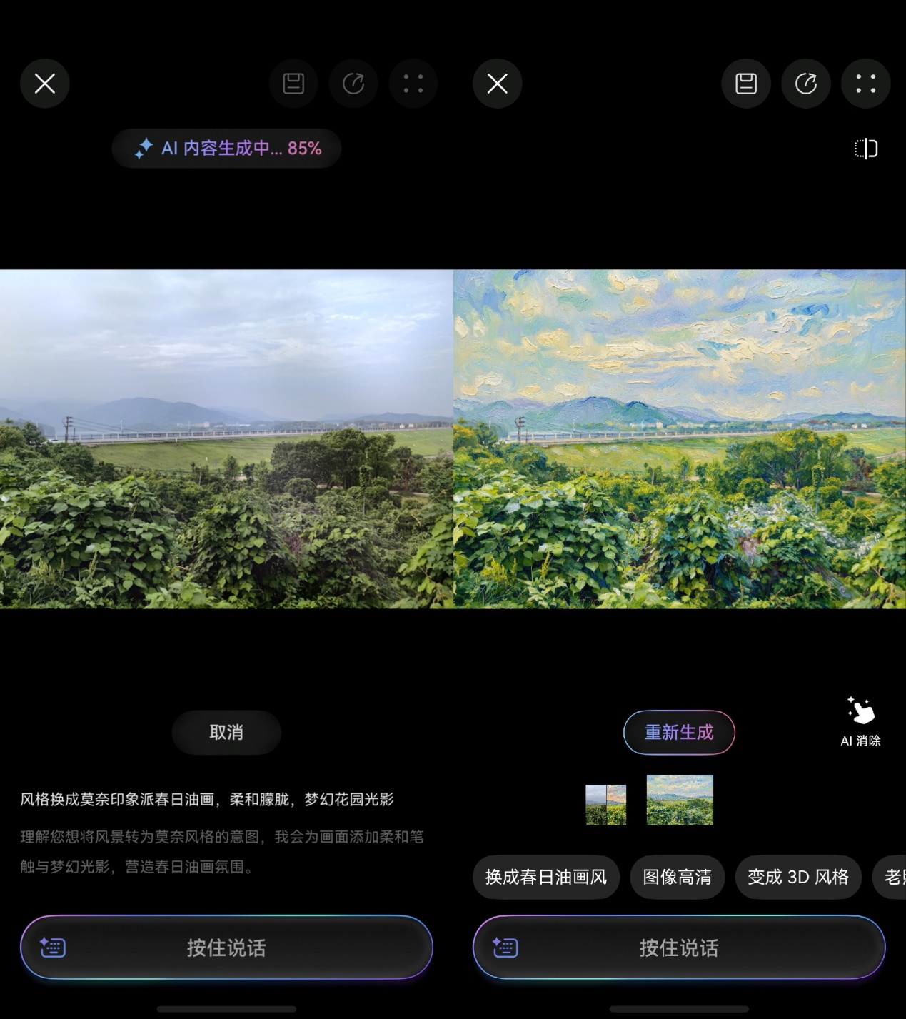除了人像外,小艺修图还专门上线了应景的“春日油画风”。原本天气阴沉,拍出来的风景灰蒙蒙的,看着就是一张典型的废片,结果小艺一键就给拯救了,色调一下子变得明亮又讨喜,整张照片瞬间变成艺术油画。