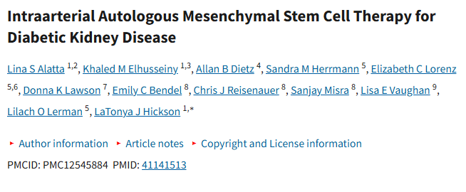 2025年发表于《肾脏国际报告》的临床研究“Intraarterial Autologous Mesenchymal Stem Cell Therapy for Diabetic Kidney Disease”显示,通过肾动脉输注干细胞干预糖尿病肾病是安全且可行的。在其中一例病例中,观察到患者肾功能下降速度有所减缓。