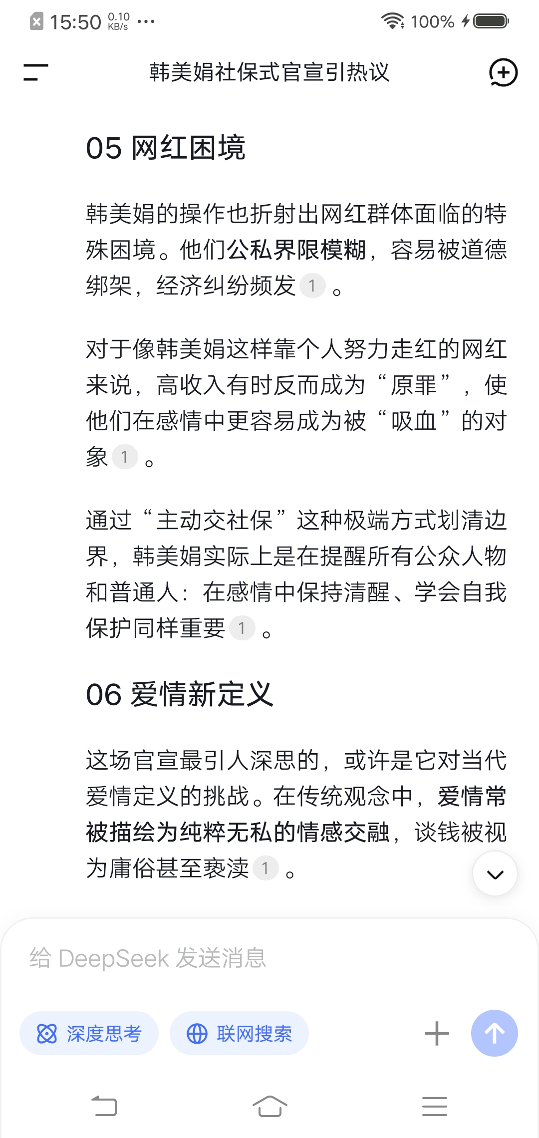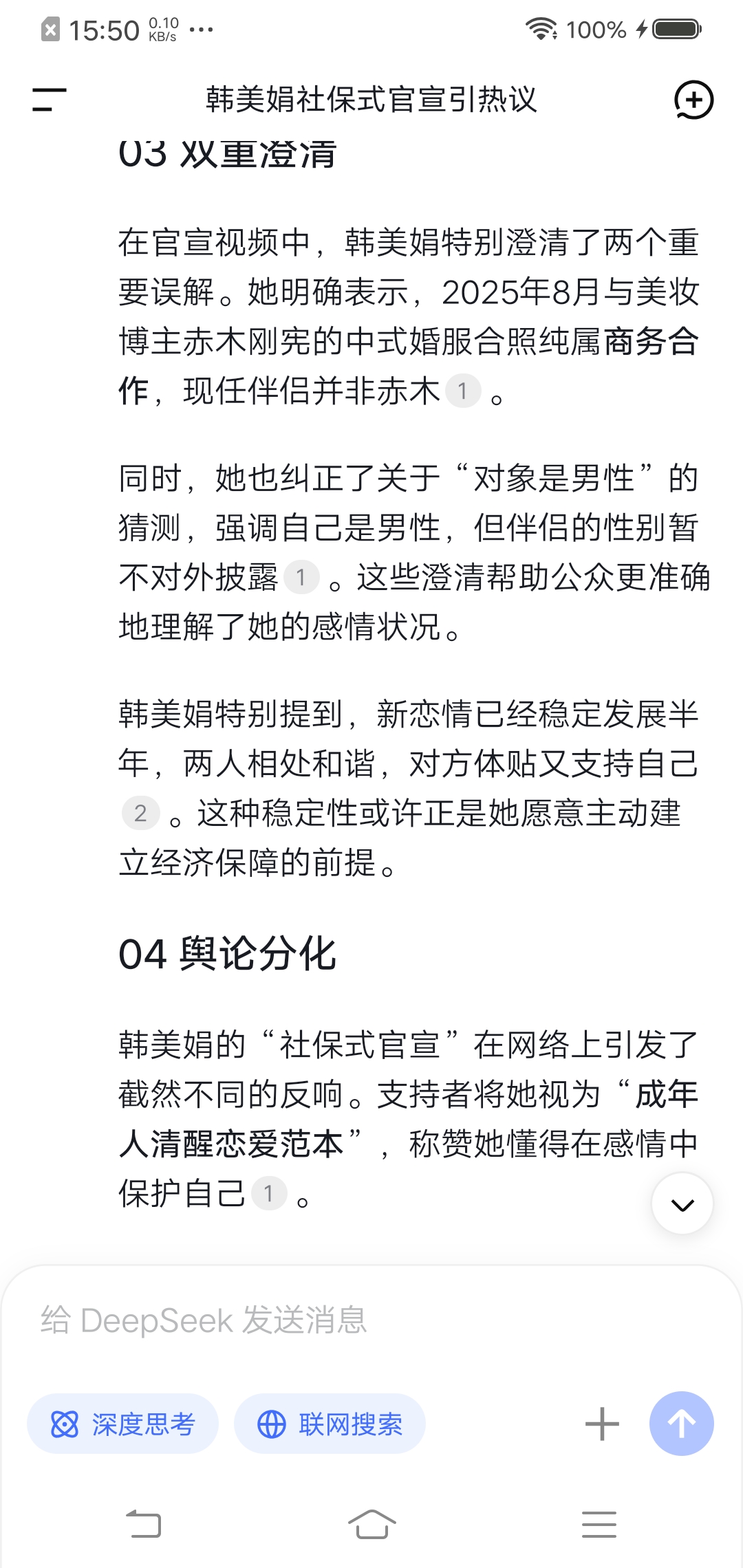 韩美娟的“社保式官宣”在网络上引发了截然不同的反响。支持者将她视为“成年人清醒恋爱范本”,称赞她懂得在感情中保护自己。