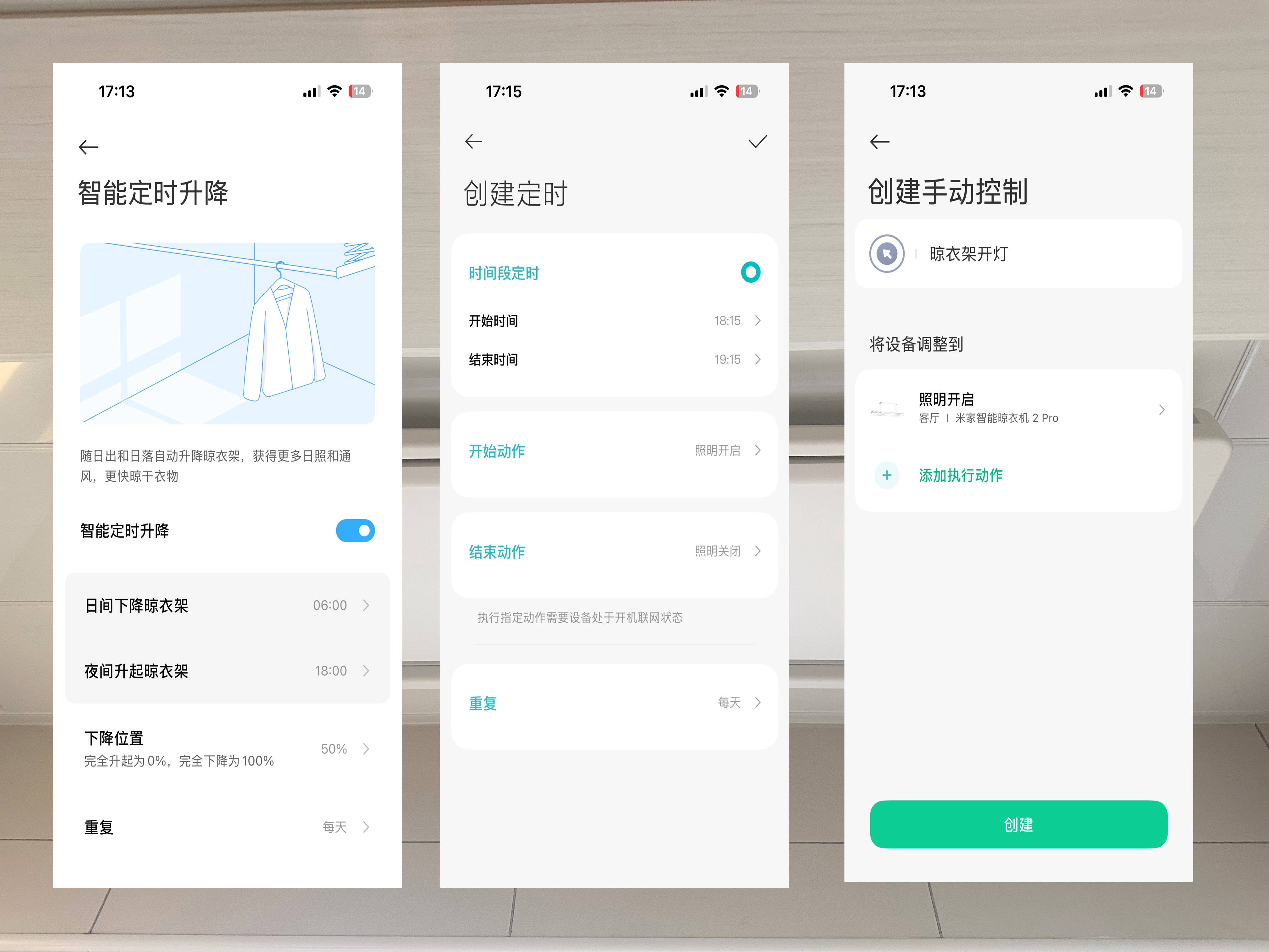 在米家APP中,也可以根据日出日落时间来设置晾衣机的升降,让衣物更多的时间接受阳光的照射。也可以进行定时开关灯的个性化设置,还可以与家里的智能设备进行联动设计。同时也支持小爱同学的联动操作,让晾衣机的操作更加简单,只需一句话就轻松搞定。