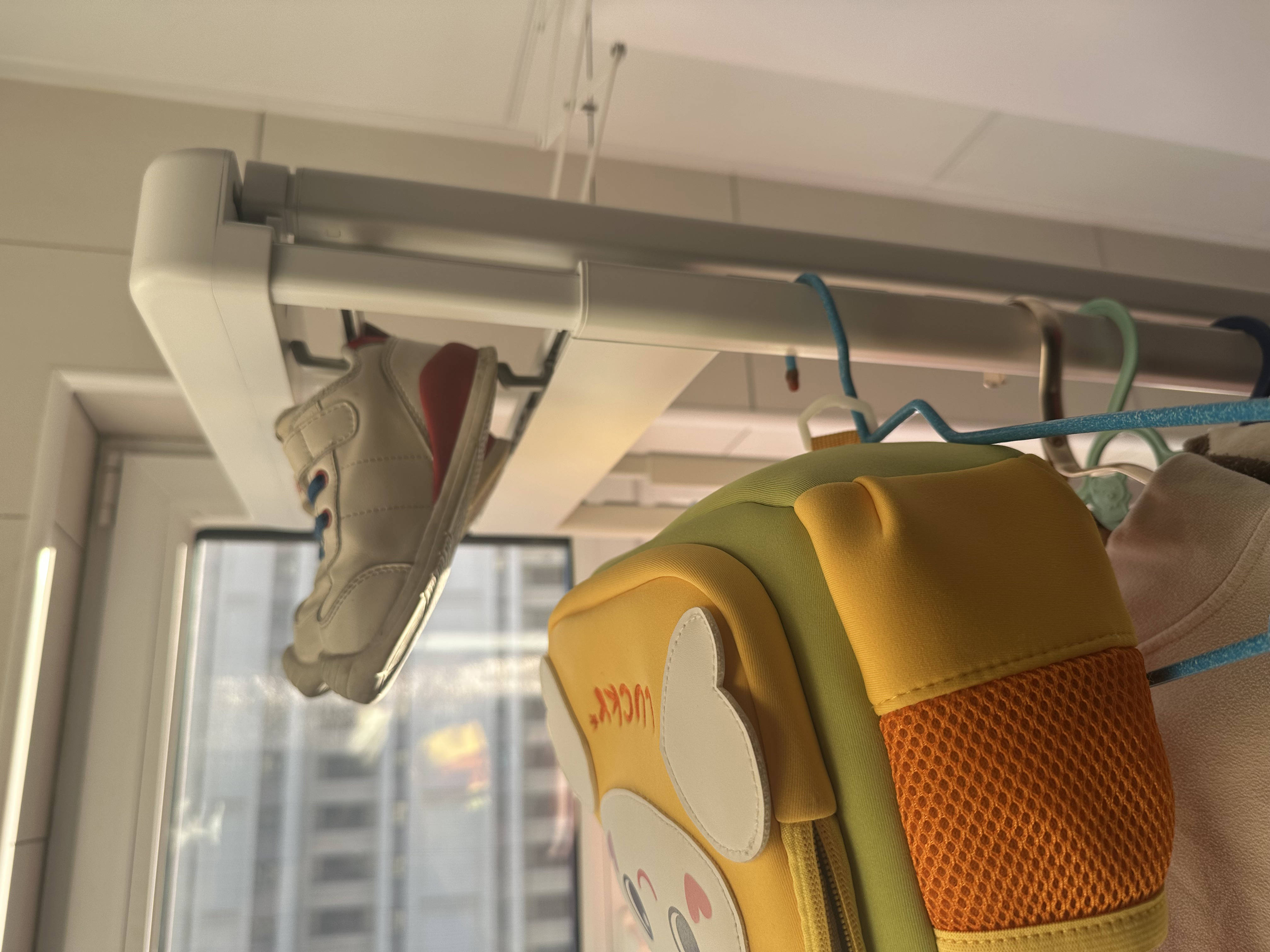 晾衣机的分区还是很合理的,这样让晾晒的衣服可以分开,每件衣物都不会碰到一起,同时让孩子的衣物也能分离开,从而保证了衣物的健康与卫生。