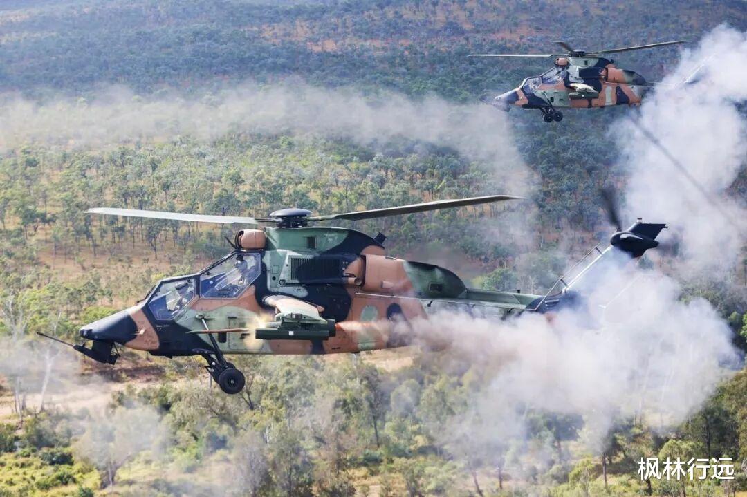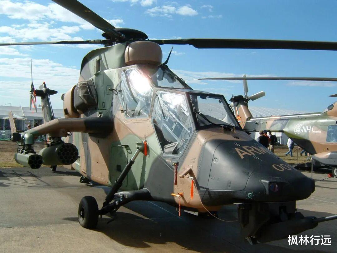 “虎”式是一种被人寄予厚望的欧洲武直,由法德联合研制,目标很简单,就是成为美国“阿帕奇”的欧版平替。它采用隐形机身设计,最大巡航速度超250公里/小时,可搭载30毫米链式航炮、AGM-114“地狱火”反坦克导弹及“毒刺”空空导弹,既能执行前沿侦察任务,又能对装甲目标实施精确打击,是澳军2004年起列装的主力武装装备,也非常适合俄乌战场的丘陵与平原作战环境。