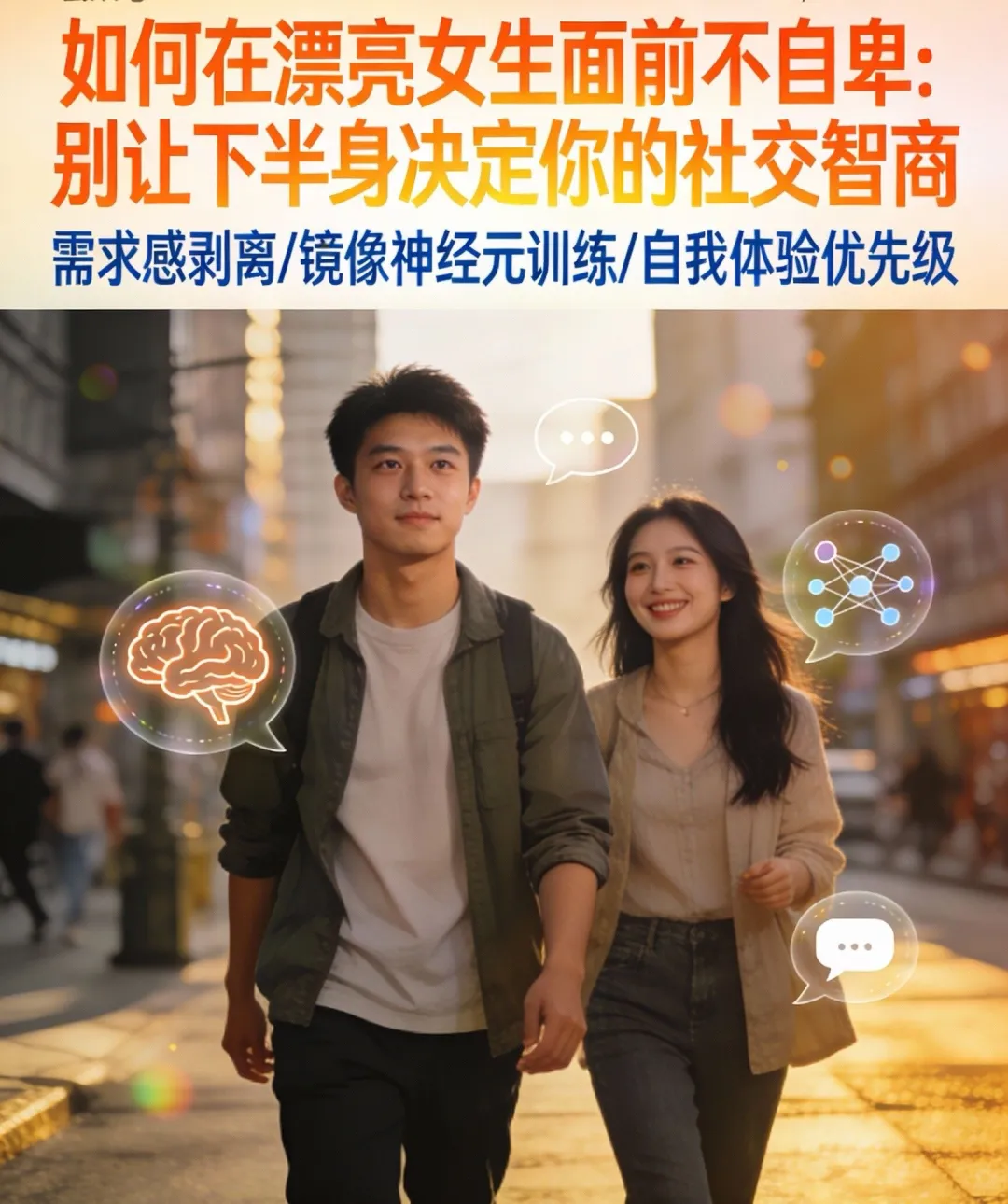 地铁门打开的瞬间,我亲眼目睹了当代男性社交灾难现场,穿格子衫的程序员小李手忙脚乱地把双肩包从胸前甩到背后,结果耳机线缠住了扶手,整个人以一个诡异的姿势半跪在地,而他对面站着的,正是公司新来的那个笑起来有两个梨涡的实习生。这种「看见美女就CPU过载」的症状,在男性群体中发病率堪比脱发。你以为是颜值差距造成的自卑?错了朋友,这是你的下半身在给大脑发错误指令。今天咱们就用最接地气的方式,把这个困扰90%男性的社交绝症给治了。