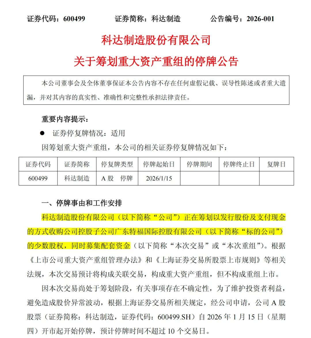 科达制造股票从1月15日起开始停牌,预计停牌时间不超过10个交易日。