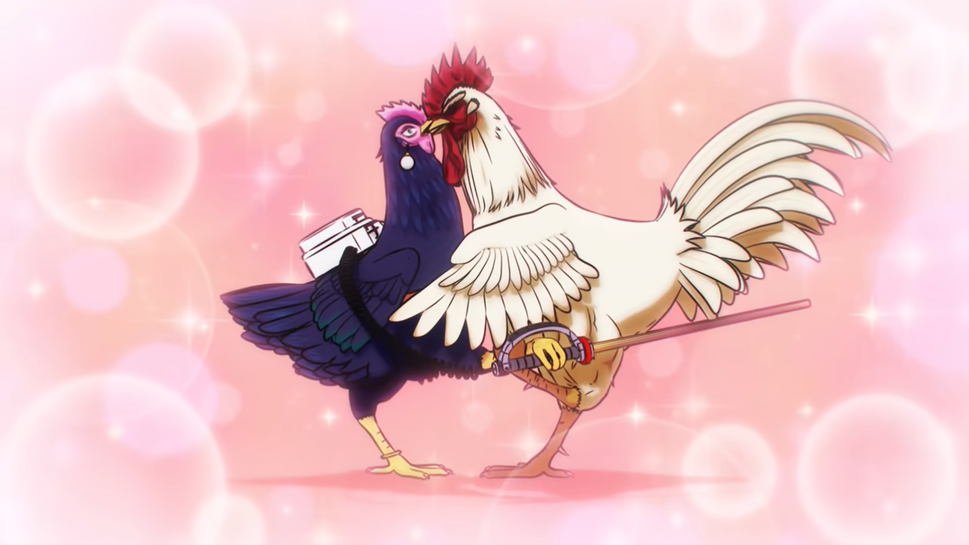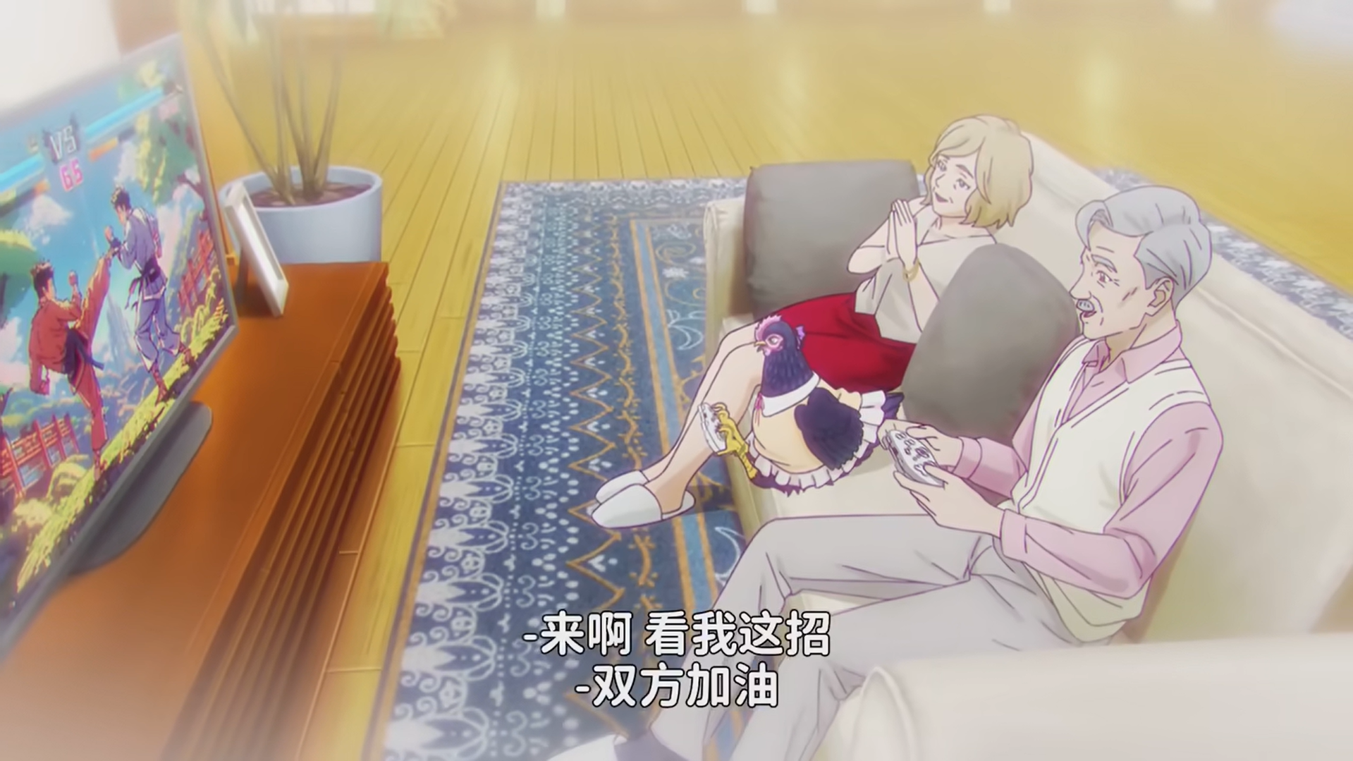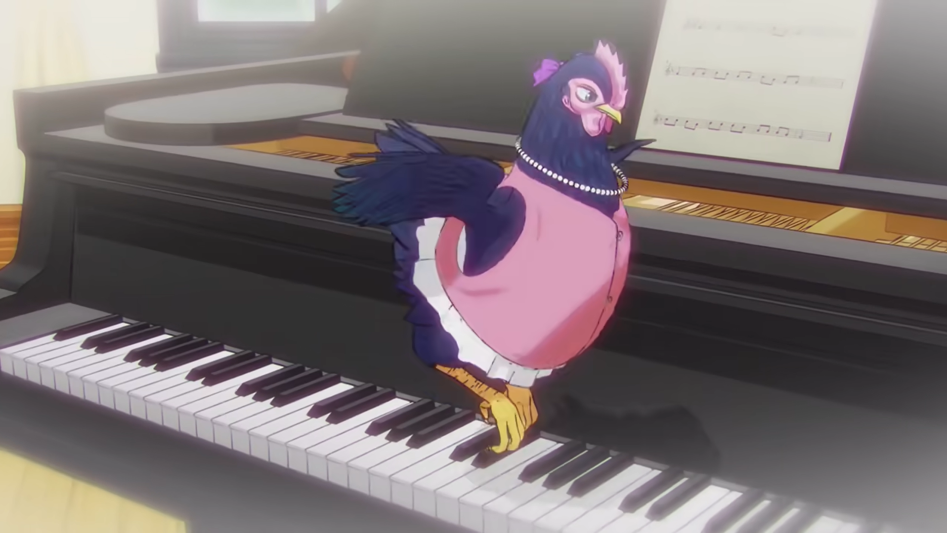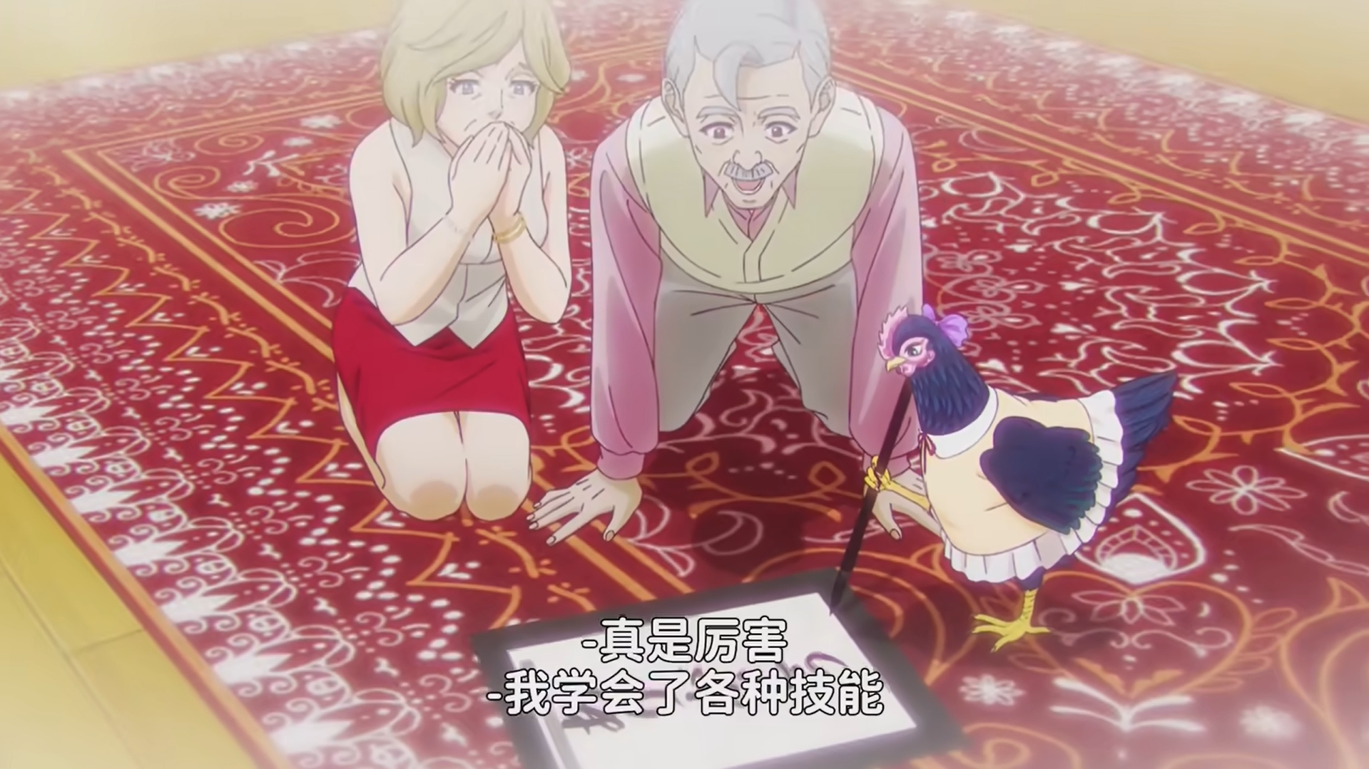 而第三话还不止这亲一下震撼,我们发现伊丽莎白这只战斗鸡还真是强啊,当然,强不在于打斗,而在于智慧。你看:品酒、舞蹈、钢琴(音乐)、手机以及打游戏等等,这完全就是贤者鸡呀。不过目前并没有看到她生出的异能(不知道是不是学习类型的?),但能学会这么多东西还真是令人惊讶不已呢。