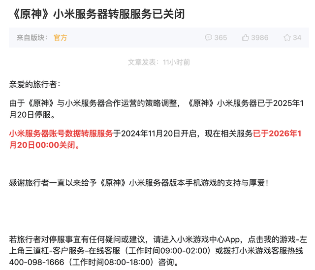 2026年1月20日,米哈游通过米游社官宣《原神》小米服务器转服服务正式关闭,未迁移的玩家账号数据将永久锁定;