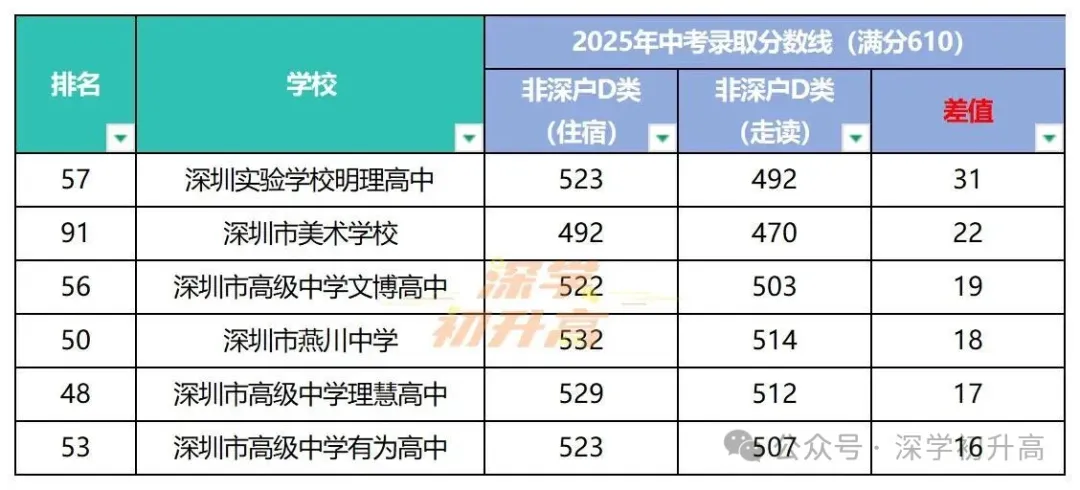 上表列举了降分空间超过20分的13所学校,其中30分以上的学校有4所,20分以上的学校有9所。主要是集中在龙岗、坪山等区。其中分差最大的是深圳实验学校明理高中,走读线比住宿线低35分!