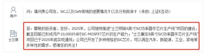 功率半导体:公司目前已形成月产10,000片6吋SiC-MOSFET芯片的生产能力。同时已开发了多种规格的SiC芯片,可以满足汽车、新能源、工业、家电等多样性的需求。