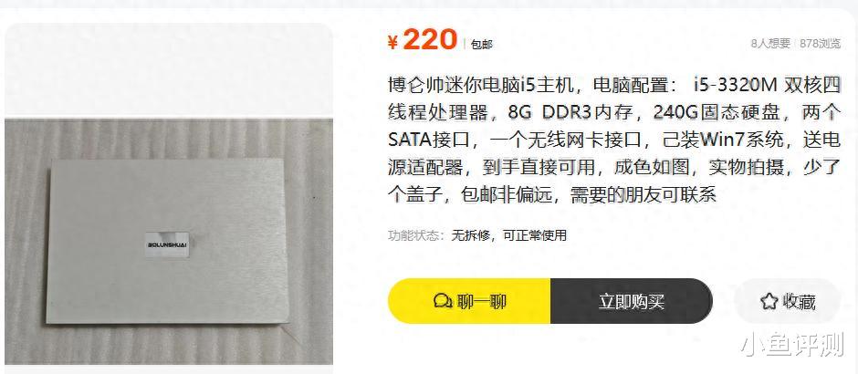 有的人可能感觉220不算地板价,我们掰开来看,一块差不多的240G二手固态大概50元,8G DDR3内存条约60元,i5-3320M的板U套(含小型主板)市场价大概在100-130元,再加上机箱电源。你自己凑齐一套,价格很可能超过220元,还要耗费时间精力去组装测试。所以,对于怕麻烦的普通用户来说,这个价位买这么一台到手即用的整机,显然是更“省力”的选择。