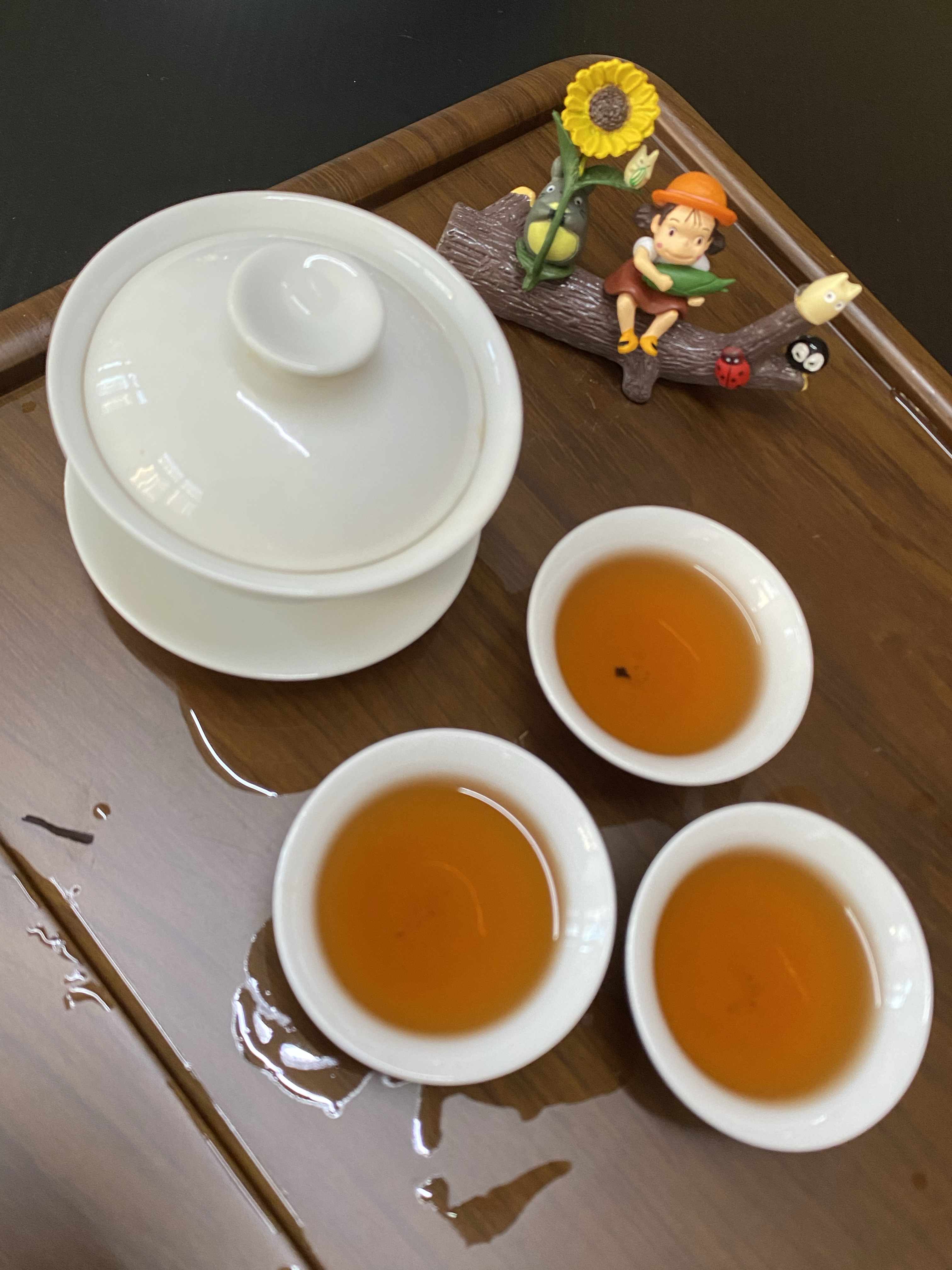 取出5g茶,用盖碗冲泡,先润洗1遍,醒茶1后正式出汤。第一泡的茶汤呈现橙红透亮的光泽,杯壁挂香明显,而且很干净,糯香与蜜枣香气交织,入口舌尖感觉很细腻醇滑,像抿了一口米汤,没有什么苦涩感,咽下后喉咙会有淡淡的甜润感泛起,回甘不算猛烈但够持久。