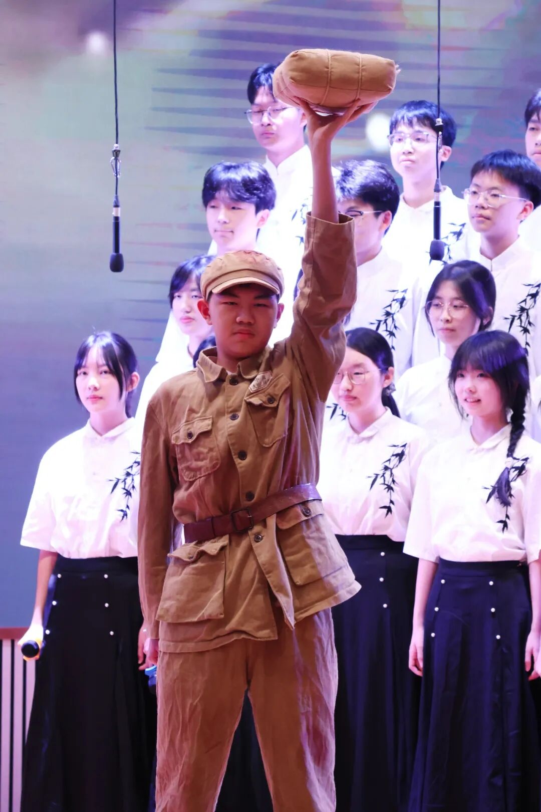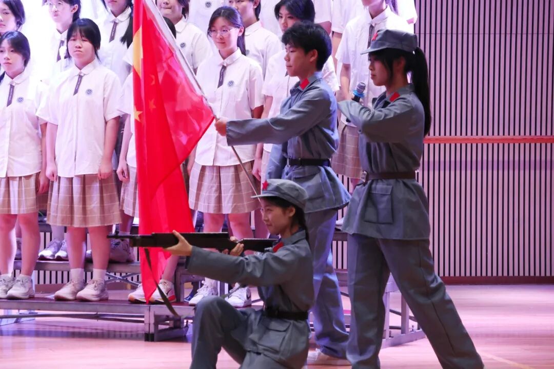 在整个演出过程中,我们看到:有的班级在《黄河大合唱》中加入了情景剧元素,学生们用肢体语言再现了先辈们保家卫国的壮烈场景;