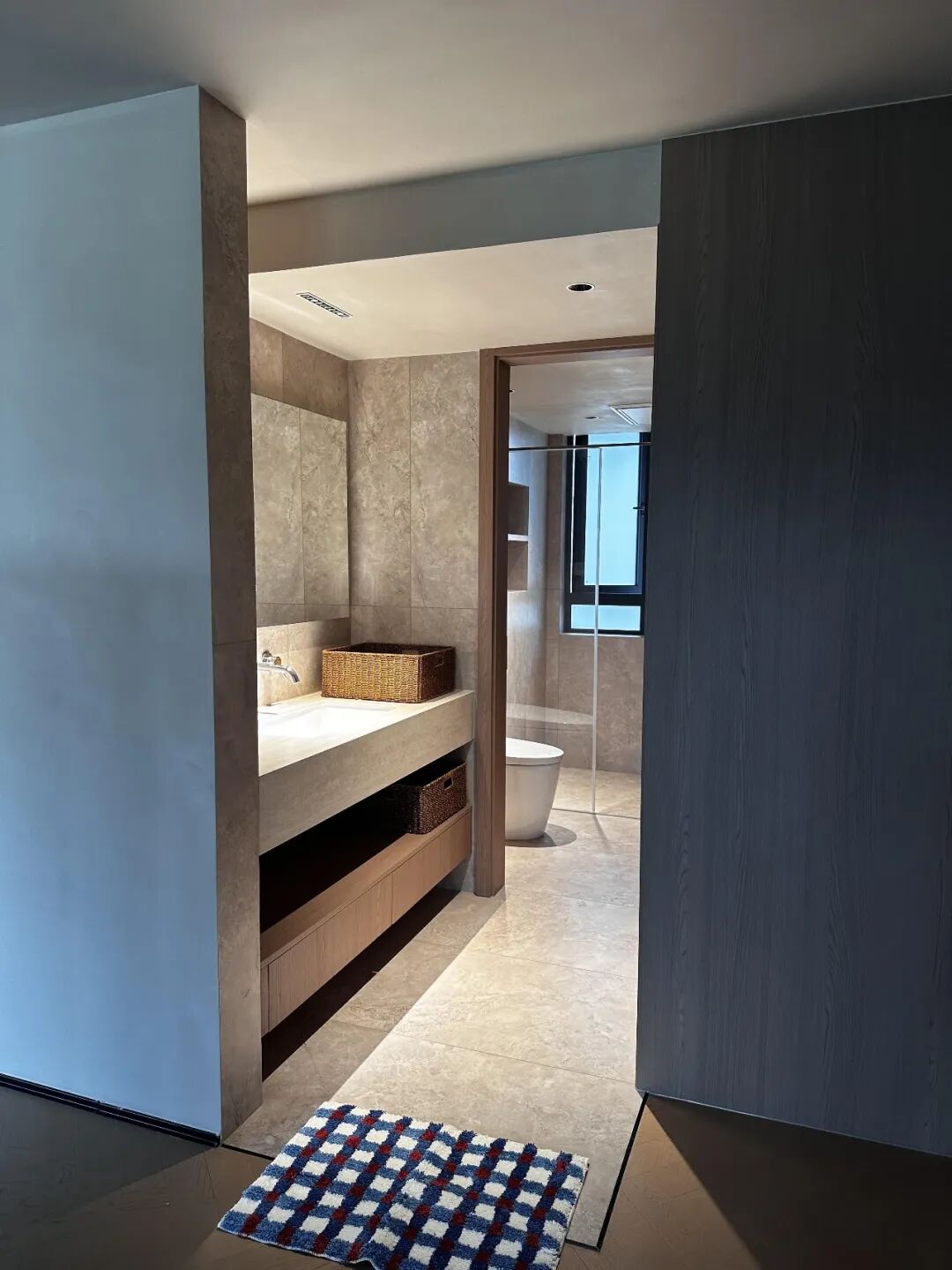 她家那房子也不大,老破小改造的。她直接把卫生间的门往里挪了半米,在外面重新砌了一堵薄墙,洗手台安排在过道,跟卫生间内部彻底分家。