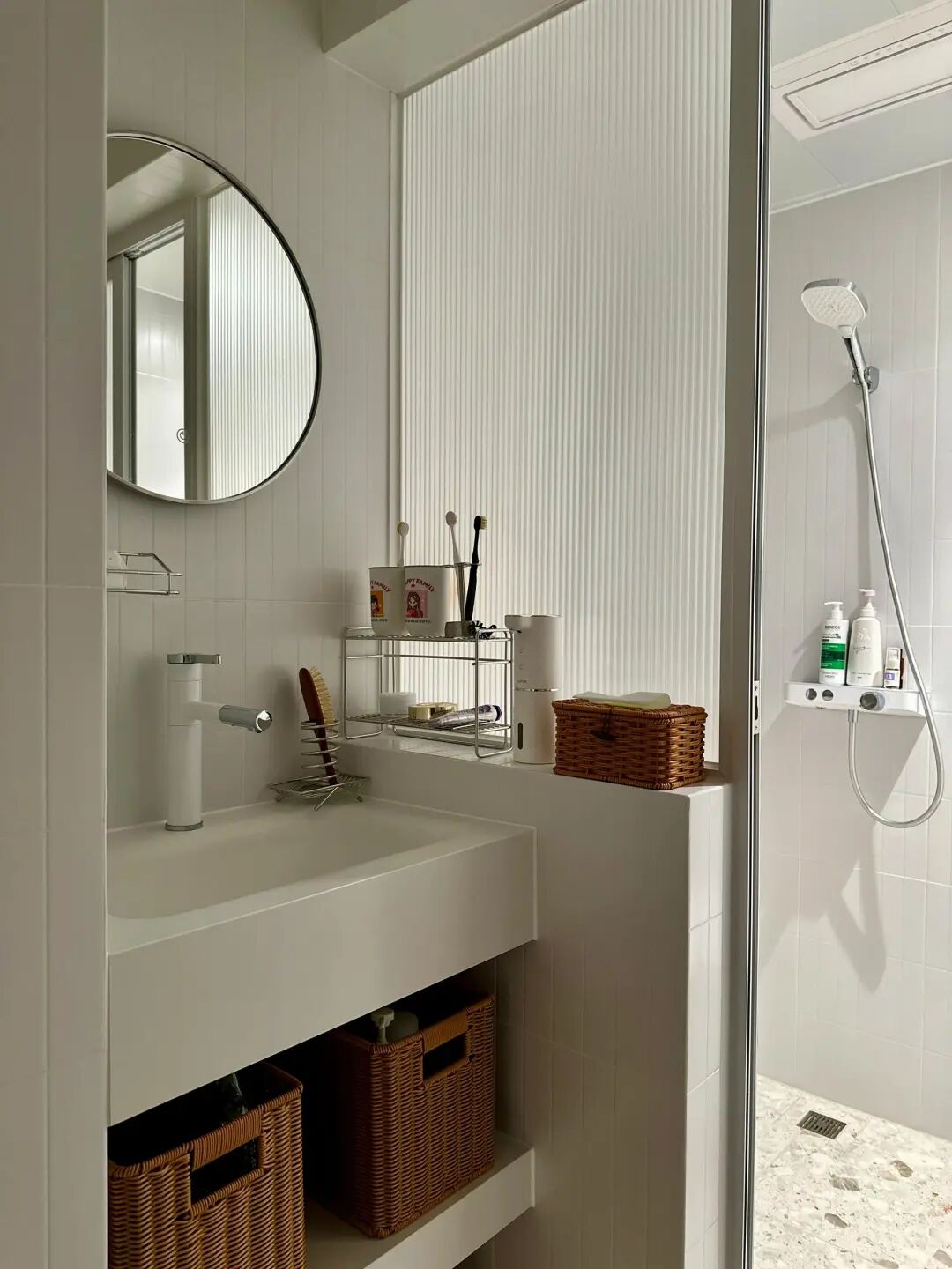 如果家里人多,担心洗漱区的声音、异味影响到其他区域,干脆砌一面实墙,把洗手台做成一个独立的空间。