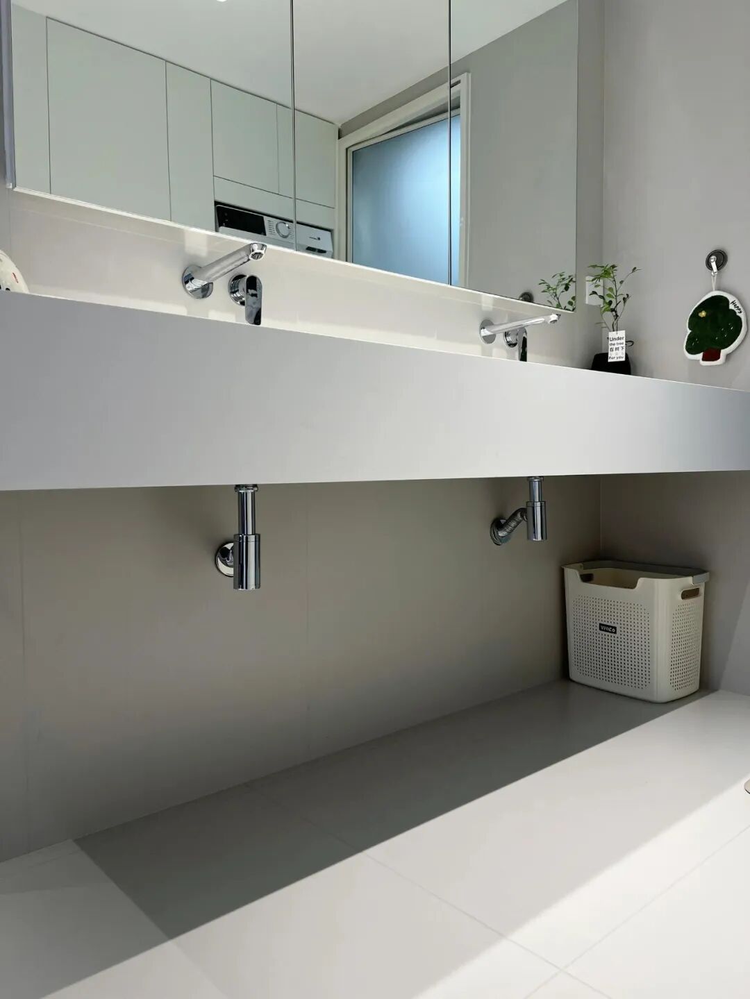 外移意味着要重新走管,施工前提前规划好上下水管道的走向,装防臭的下水管,不然以后返味就麻烦了。水管走墙排,把管子藏进墙里,这样洗手台下面悬空,也不会有卫生死角。