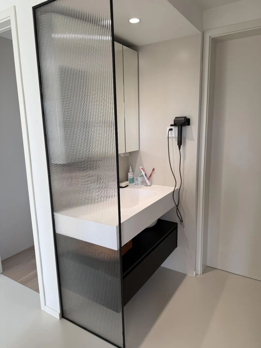 担心外置洗手台杂乱,或者怕隐私泄露,就选玻璃隔断!长虹玻璃、磨砂玻璃都可以,透光不透人,既能遮挡洗漱区,又不会影响家里的采光。