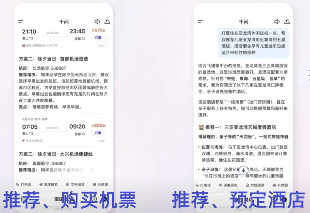 如此便捷的操作,你可以平移到订饭店、买火车票、买演出票等消费场景。也就是说,千问可以接入任何一种生活需求,让用户以省心省时的方式,在它这里完成消费和体验满足。