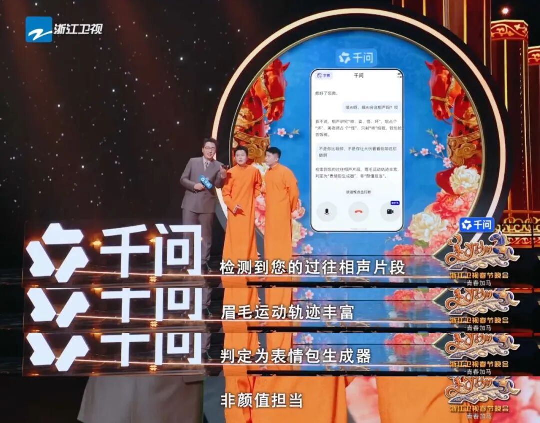 操作简单,但活儿一点不糙。千问对着孟鹤堂贴脸开大,一会儿拆穿对方是“表情包生成器”,一会儿当场批改晚会作品,好一场酣畅淋漓的现挂。那场面,你很难忍住不笑,可又惊呆到顾不上笑。