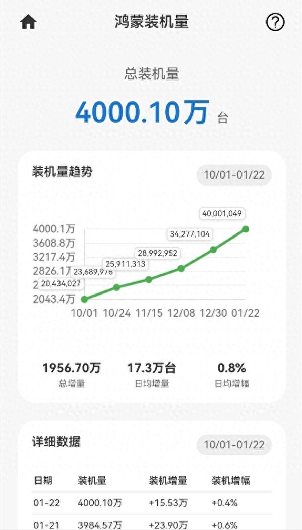 12月底是3400万台左右的装机量,但一月没结束就是4000万装机,也就是说22天左右是600万台的装机,大概就是这个数据。你基本可以预测出,一月份现在的华为手机出货在800万台左右,问题不大。毕竟现在不是全部手机都是预装原生鸿蒙,还有一些比如畅享70x系列的产品,还是没有使用原生鸿蒙系统装机,至少有一些产品不是。