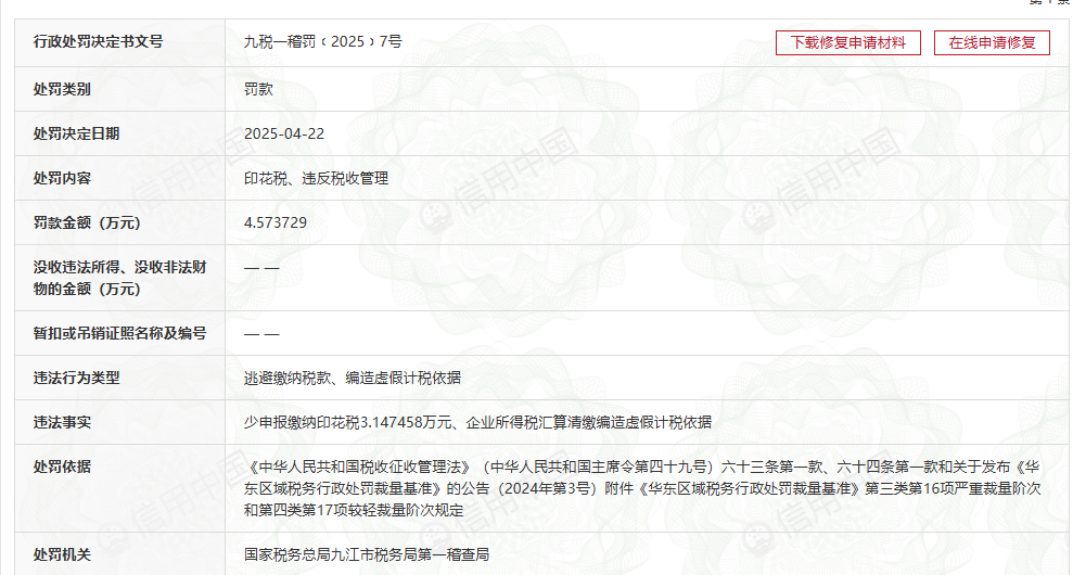 4月份,子公司共青城市正邦生物科技有限公司因“少申报缴纳印花税3.147458万元、企业所得税汇算清缴编造虚假计税依据”被处罚。