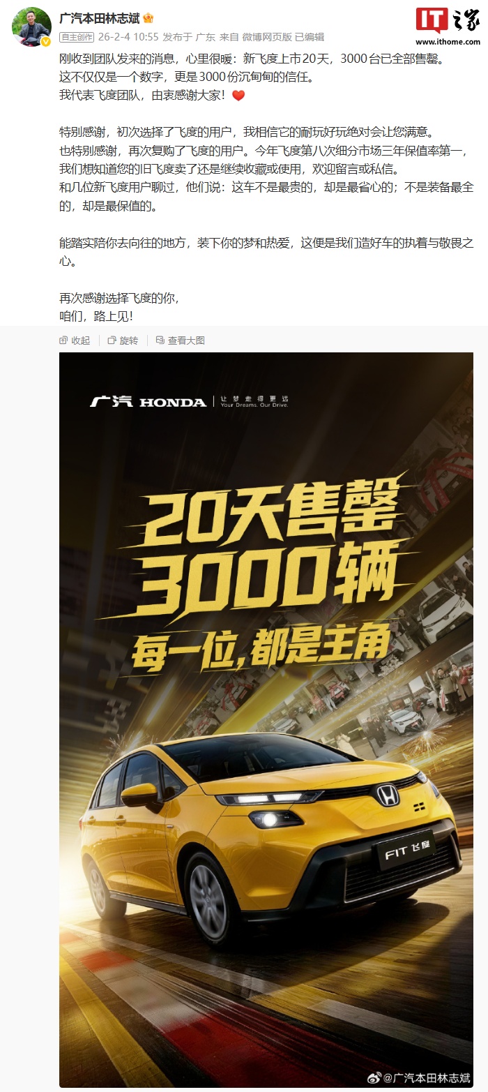 IT之家注意到,广汽本田汽车有限公司副总经理林志斌今日宣布,新飞度上市 20 天,3000 台已全部售罄。他还透露,今年飞度第八次细分市场三年保值率第一。