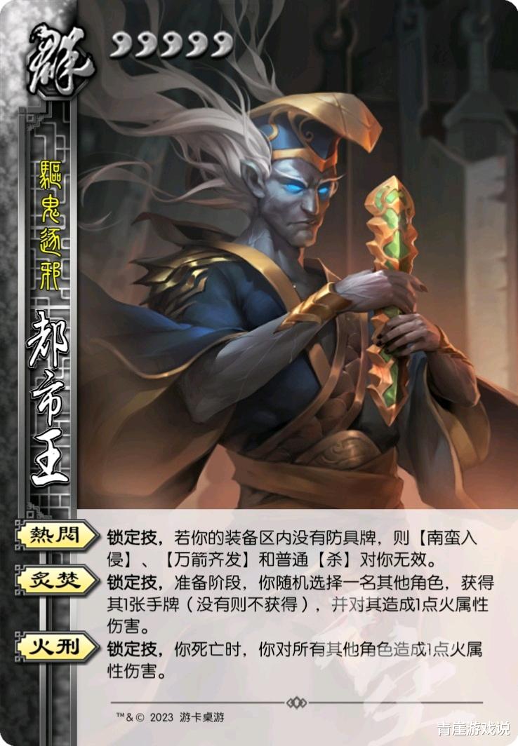 第八位阎王是都市王,【热闷】是自带没有负面效果的藤甲!【炙焚】是偷牌兼具火焰伤害,【火刑】是死亡时对全场玩家造成一点火焰伤害。都市王防御强,而且火焰伤害不容小觑。虽然没有三点伤害那么爆炸,但小心你会无法轻松击败他!
